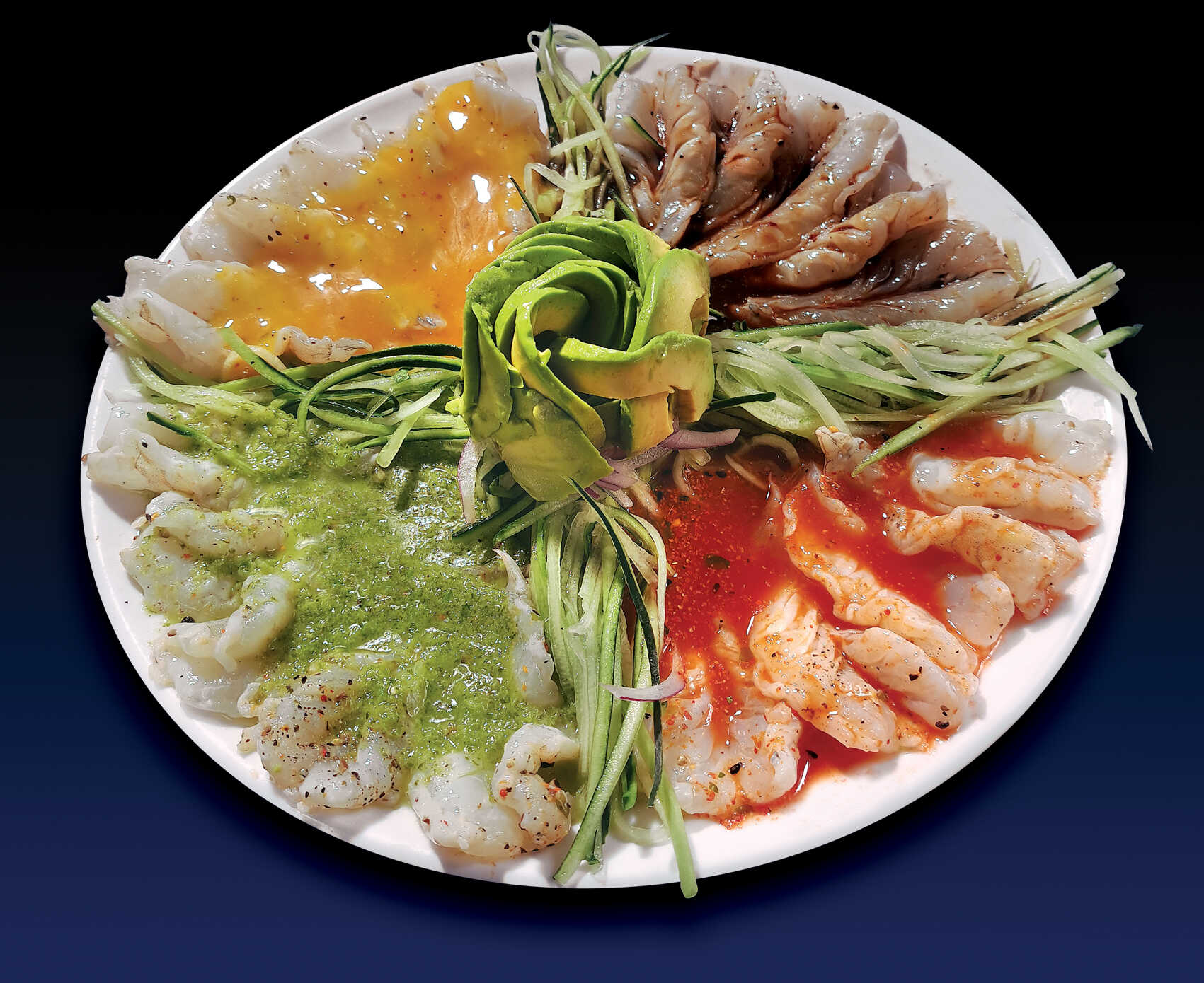 Combinación de mariscos (camarón mixto, atún y pulpo), aguacate, poro y salsa tropical 140 g.