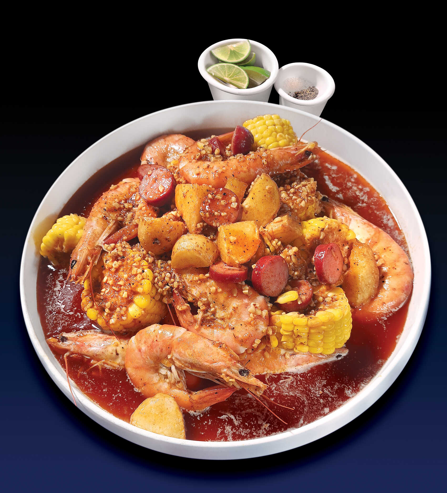 Camarones estilo louisiana: camarón con cabeza, elote, papa y salchicha.