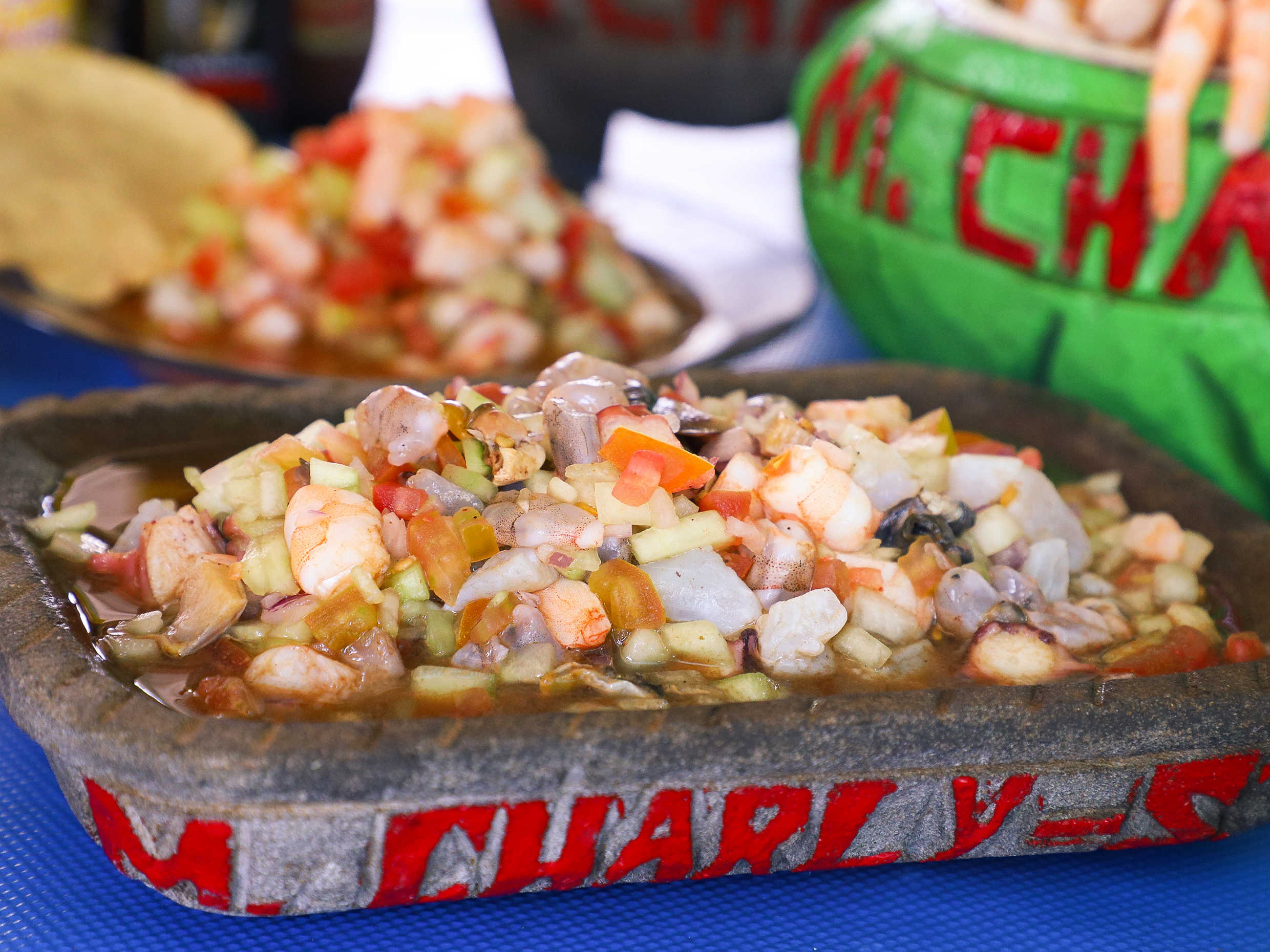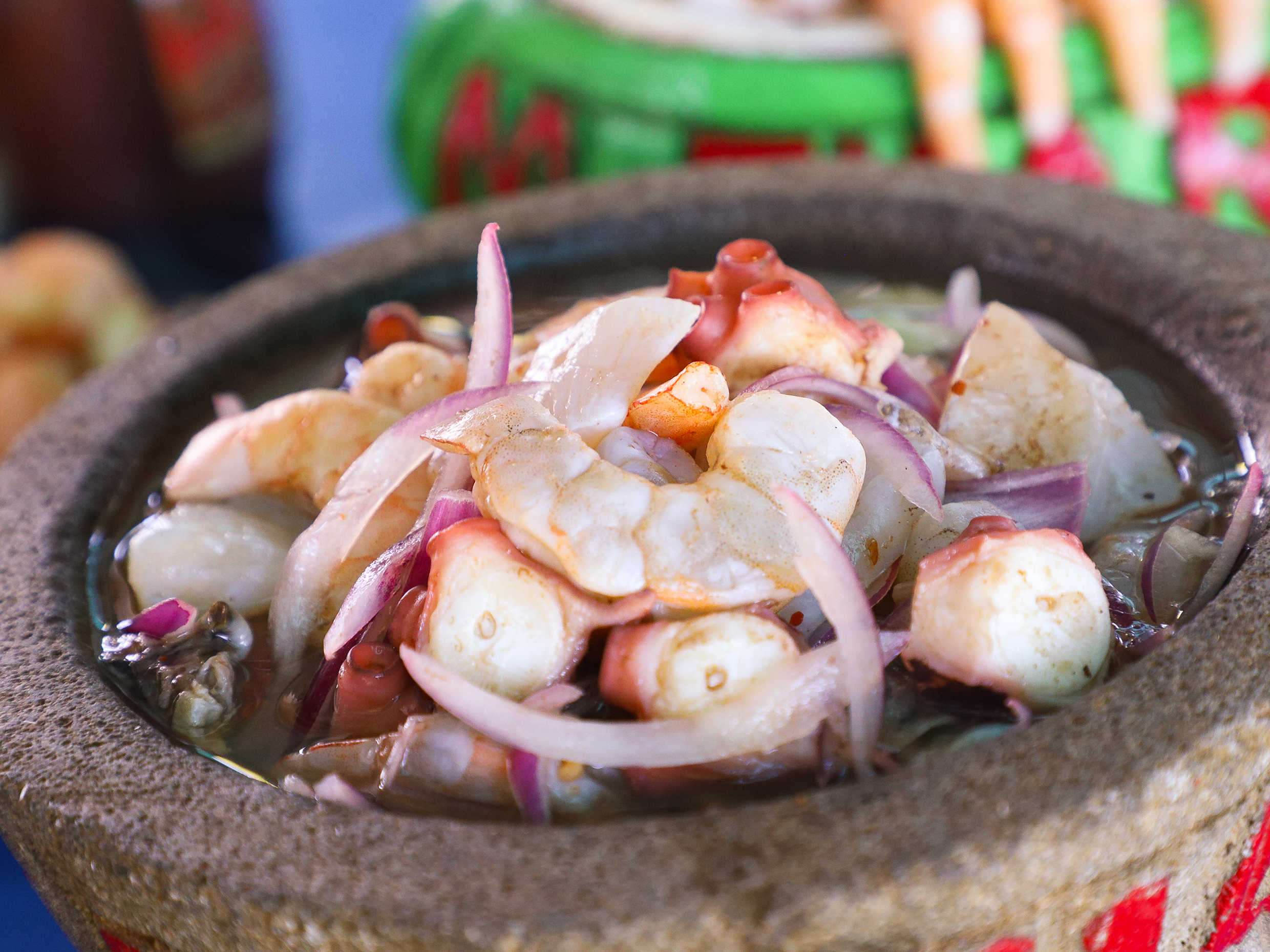 Molcajete de 1 litro, Camarón cocido, pulpo, aguachile, calló de lobina, patas de mula, verdura, caldo de camarón y salsa negra.