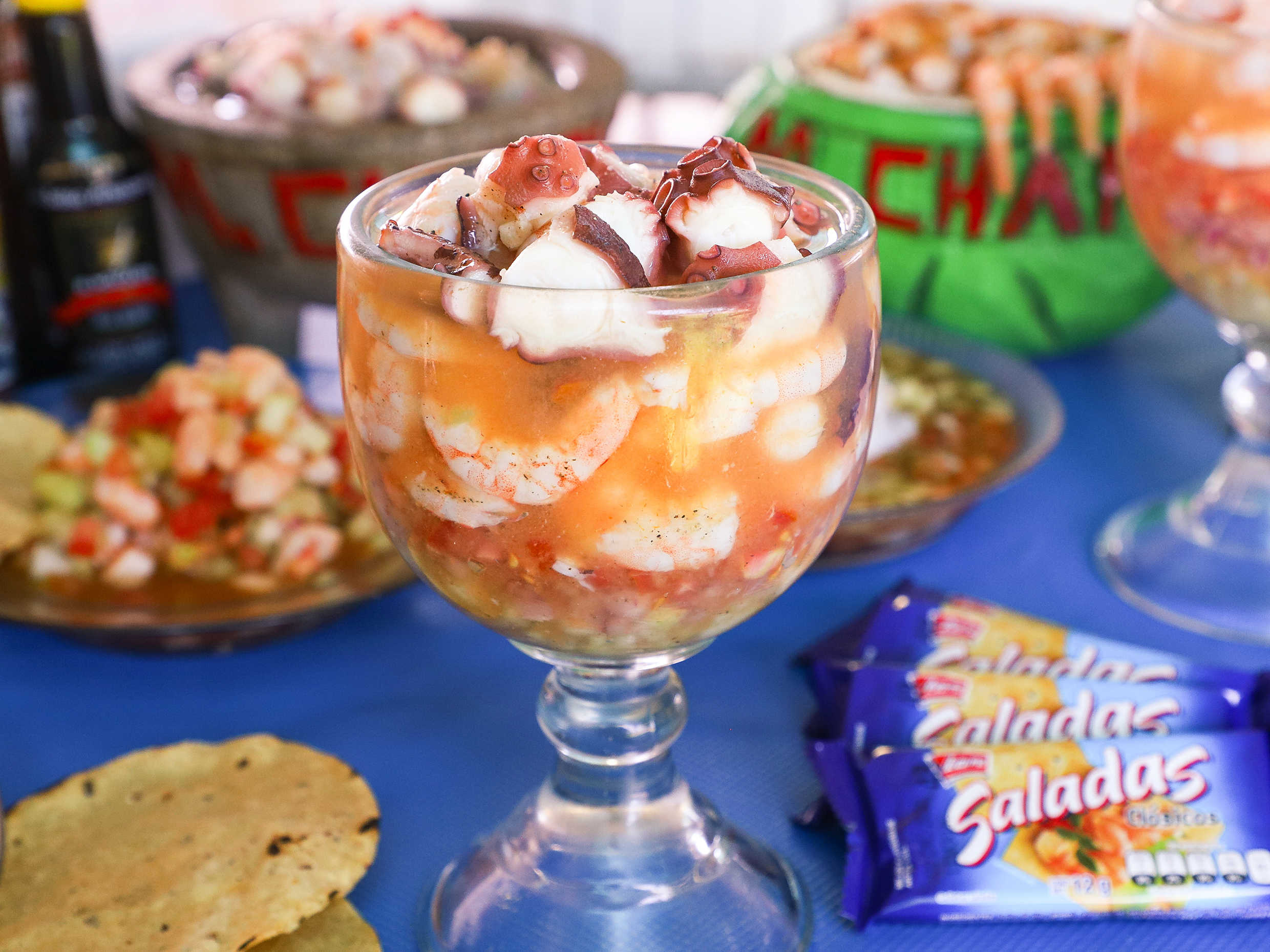 Coco camarón cocido, pulpo, pepino, caldo de camarón, clamato y salsa negra.