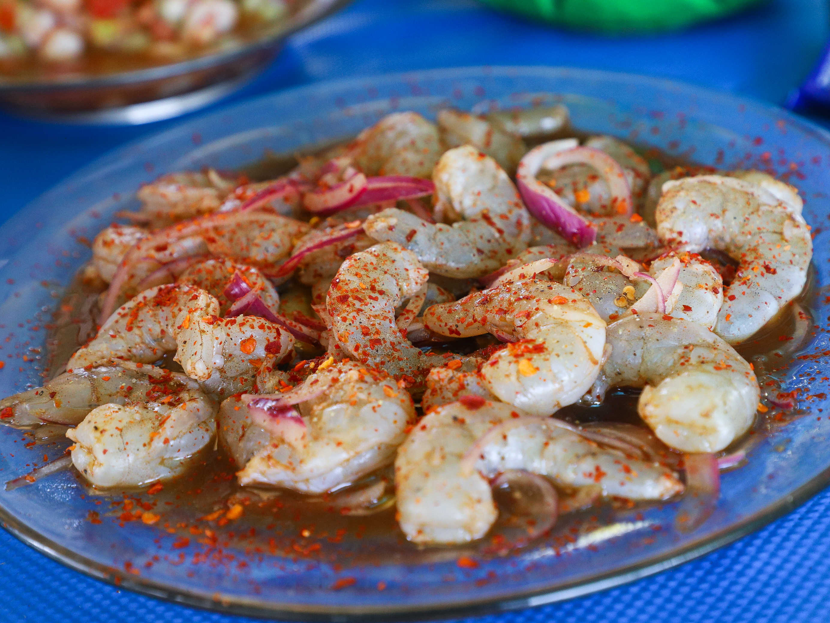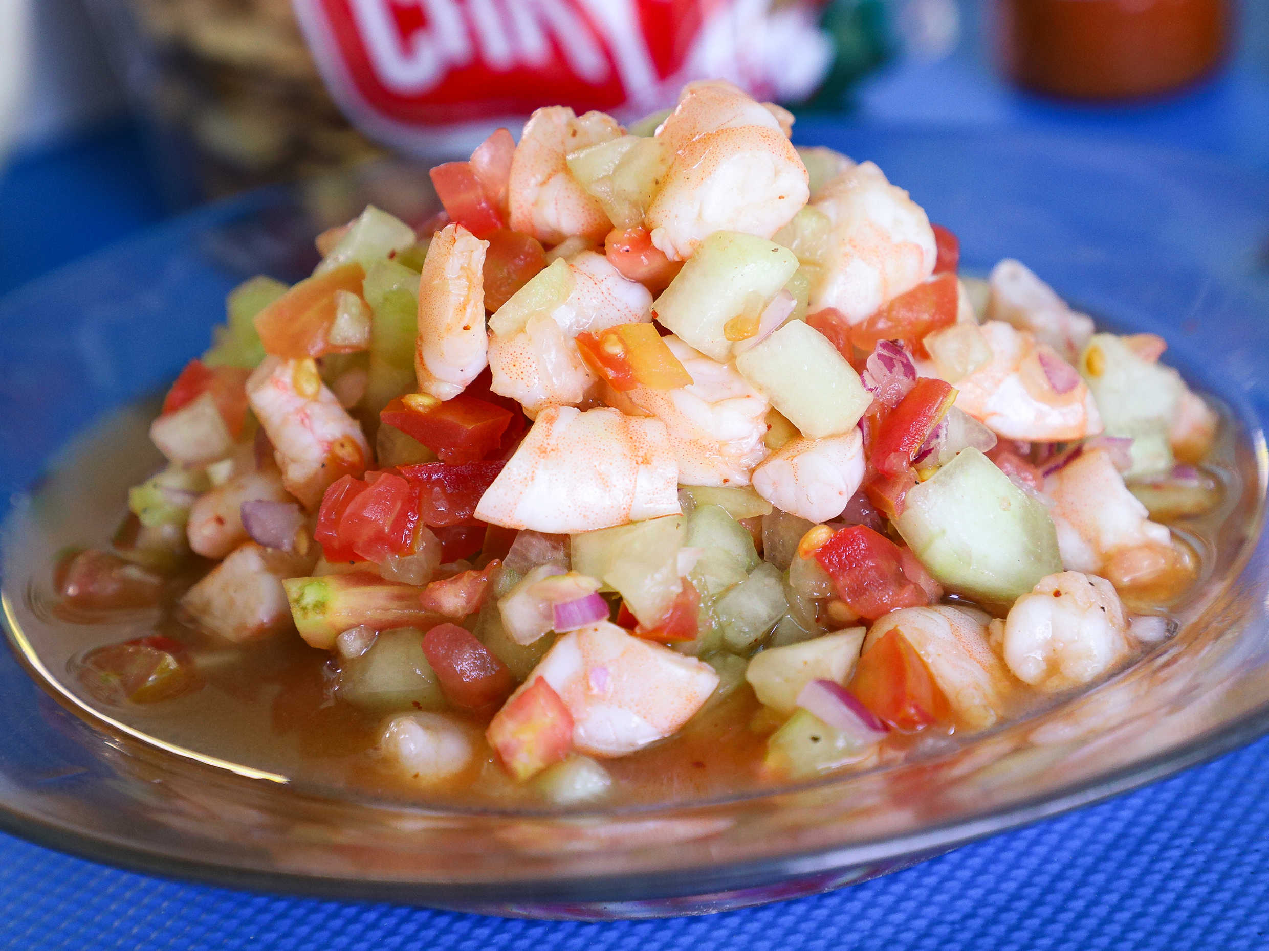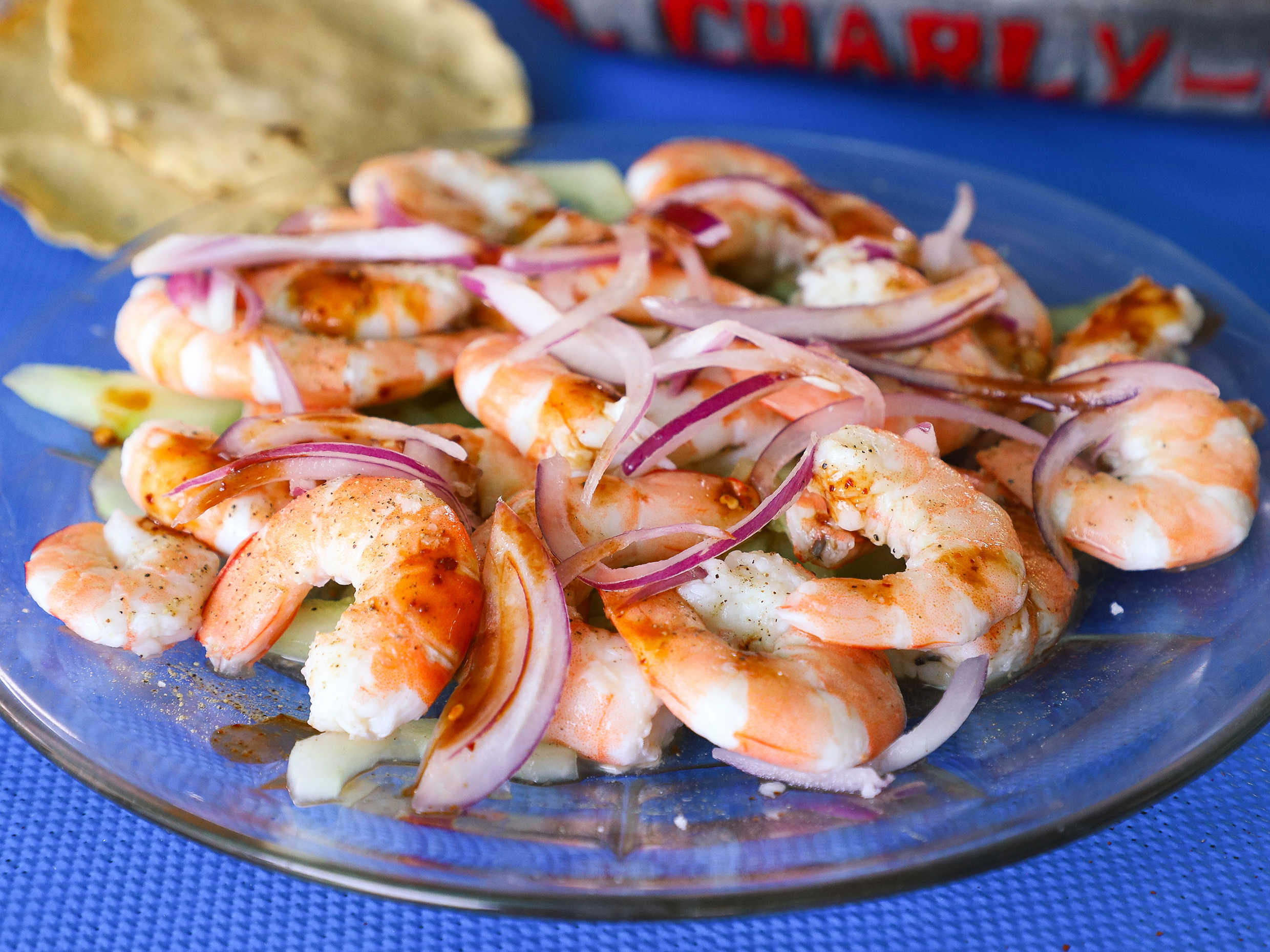 Camarón cocido, aguachile, pepino, cebolla, salsa negra y caldo de camarón.