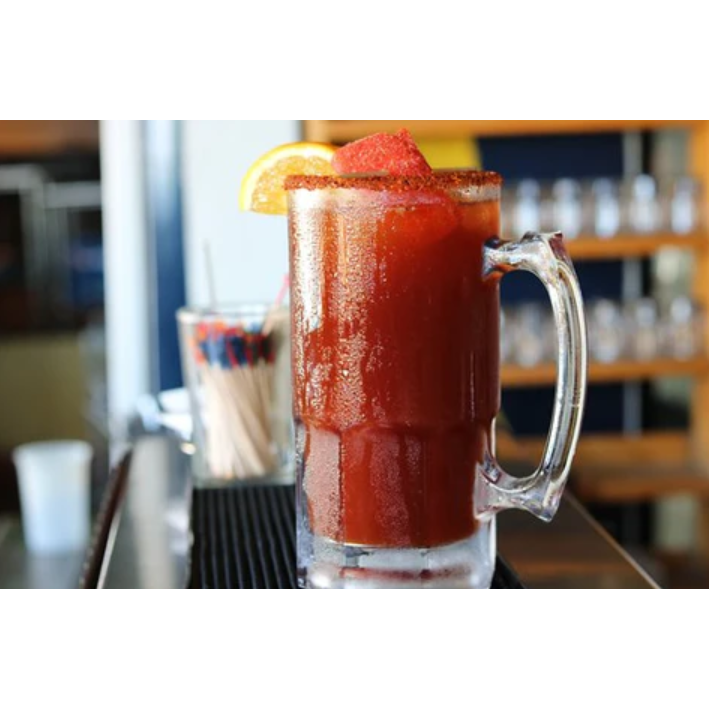 Hielo, clamato, caldo de camarón, salsado y tajín.