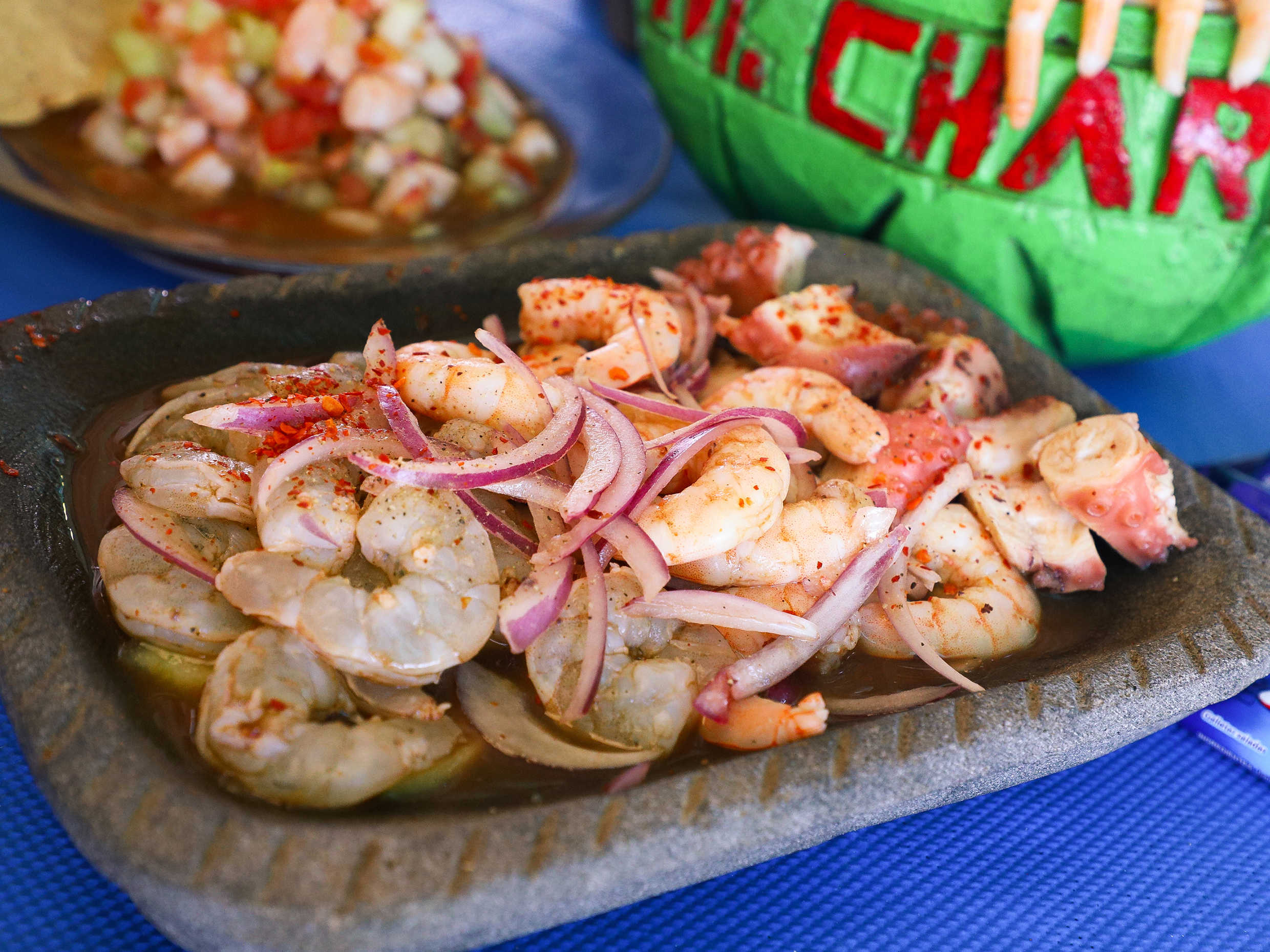 Camarón cocido, pulpo, pepino, cebolla y salsa negra.
