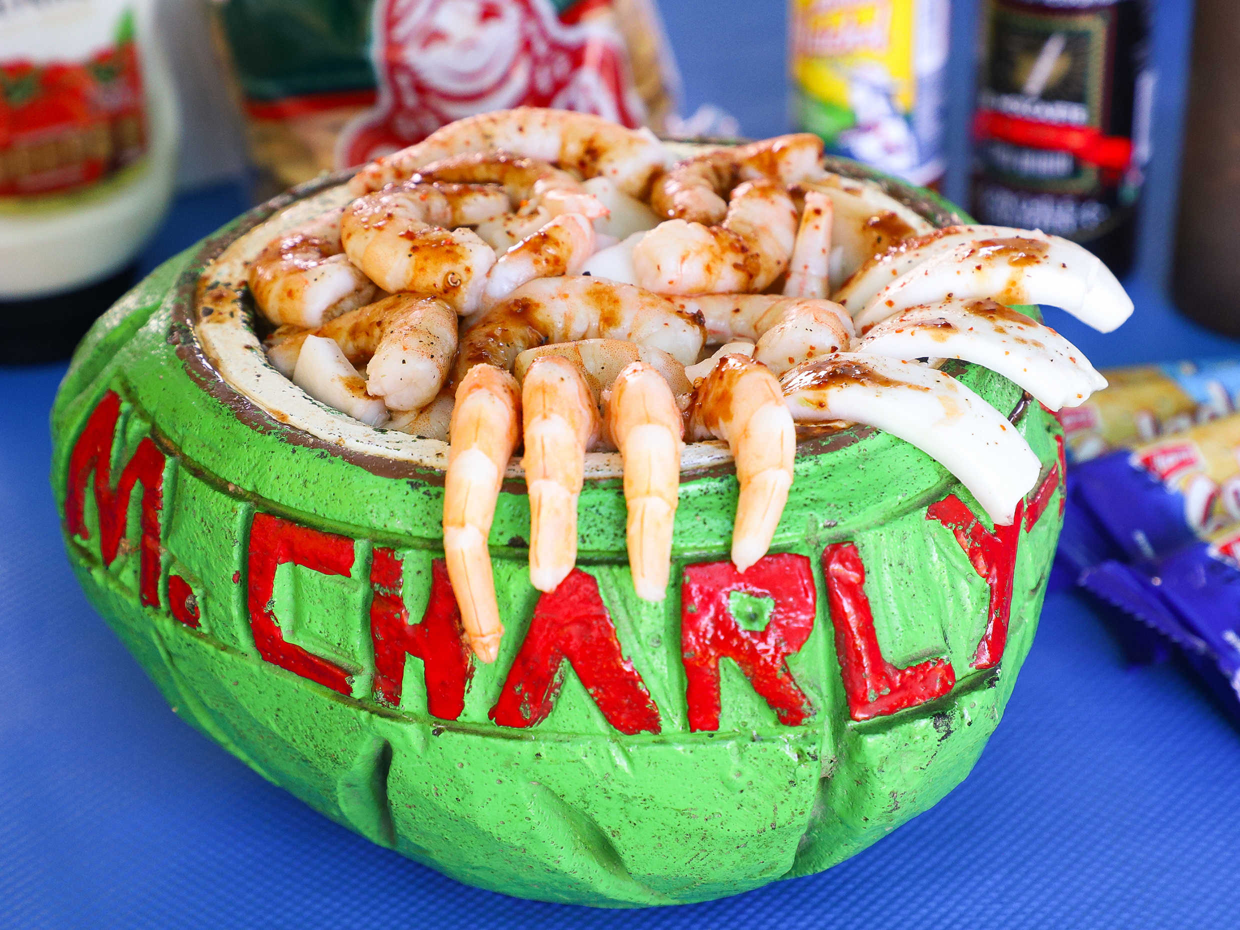 Coco, camarón cocido, pepino, caldo de camarón, clamato y salsa negra.