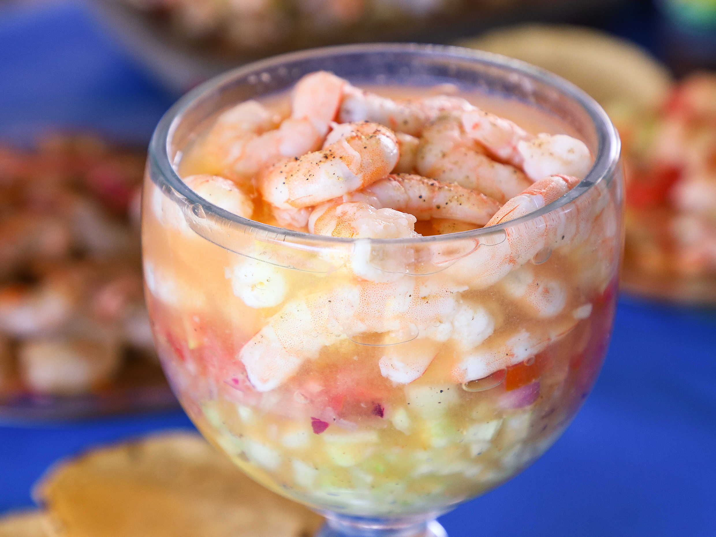 Camarones cocido, verdura, caldo de camarón, clamato y salsa negra.