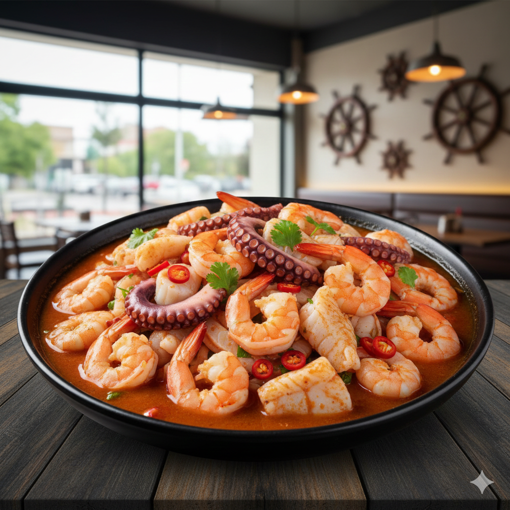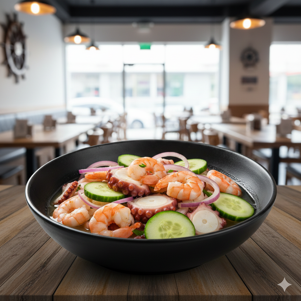 Camarón cocido, crudo y pulpo, bañado en nuestra salsa especial de la casa (porción personal).