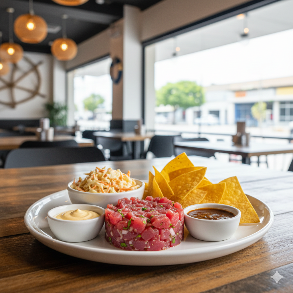 Tártara, ensalada de col, salsa tatemada y totopos de maíz.