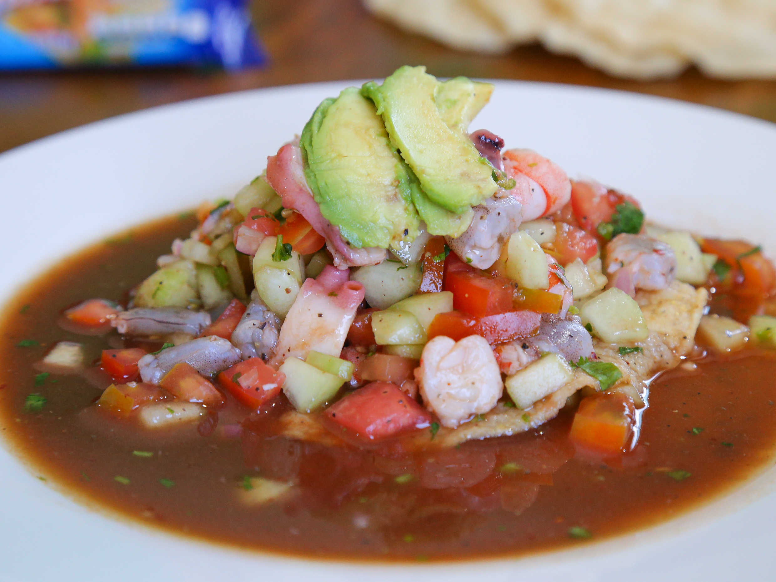 Ingredientes. Camarón cocido, Camarón crudo, pulpo, lobina, cebolla y pepino.