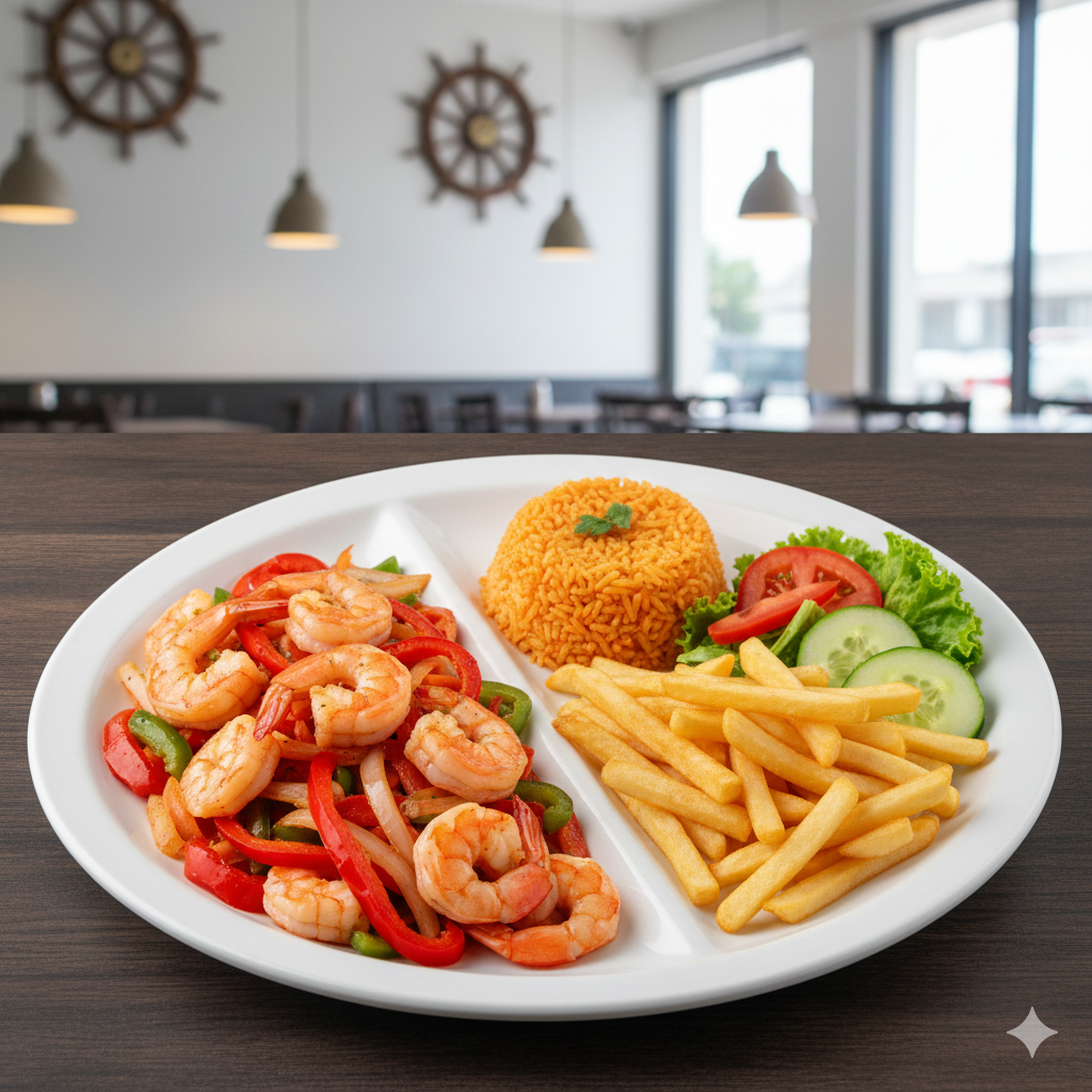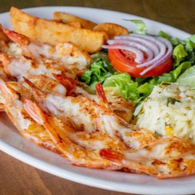 200 gr. Ingredientes. Camaron, cebolla, chile morrón, tomate, acompañados de papas, ensalada y arroz.