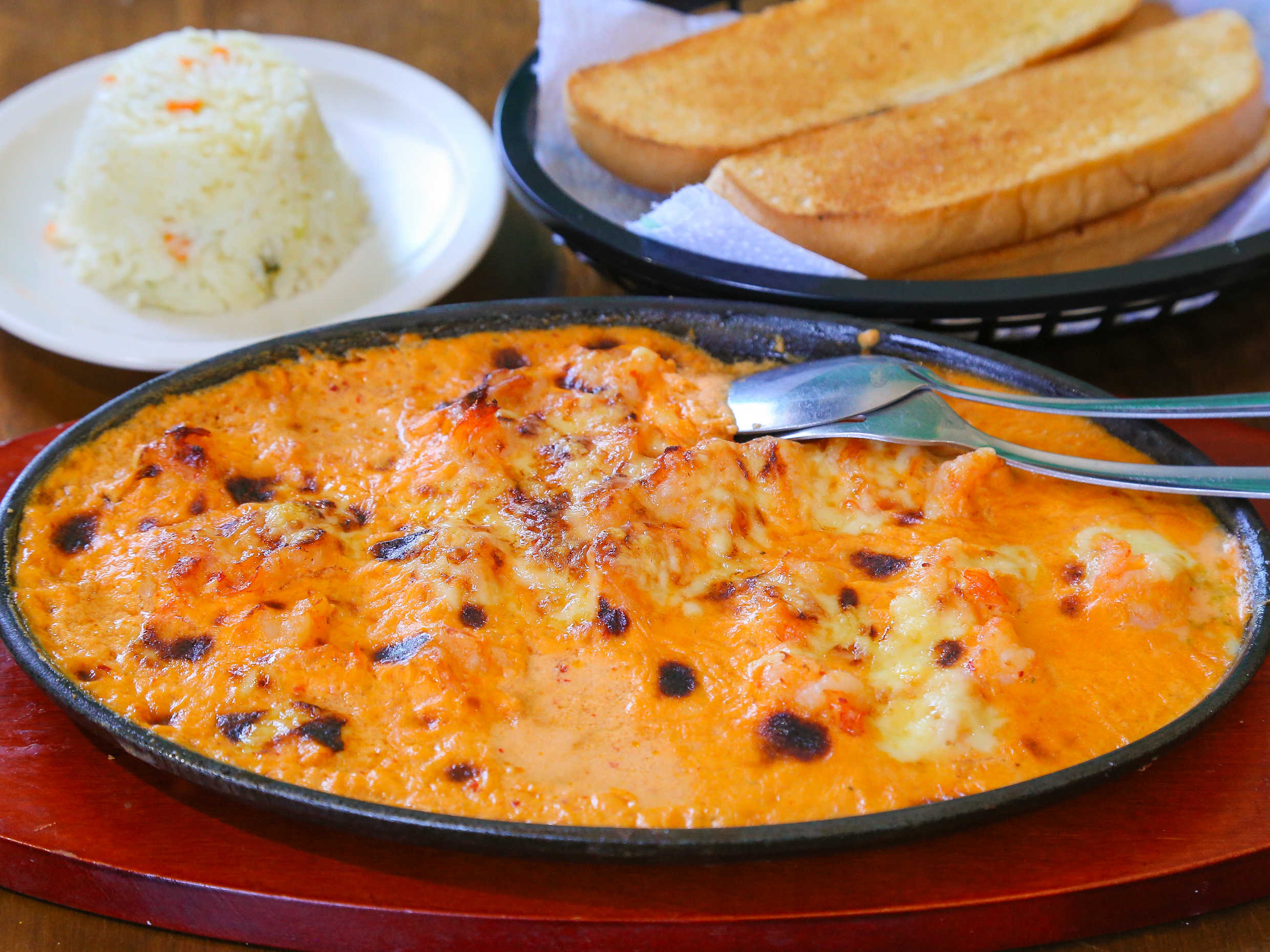 200 gr. Ingredientes: Camarón, greiby de chile morrón rojo, queso gratinado, acompañado de pan con mantequilla, arroz.