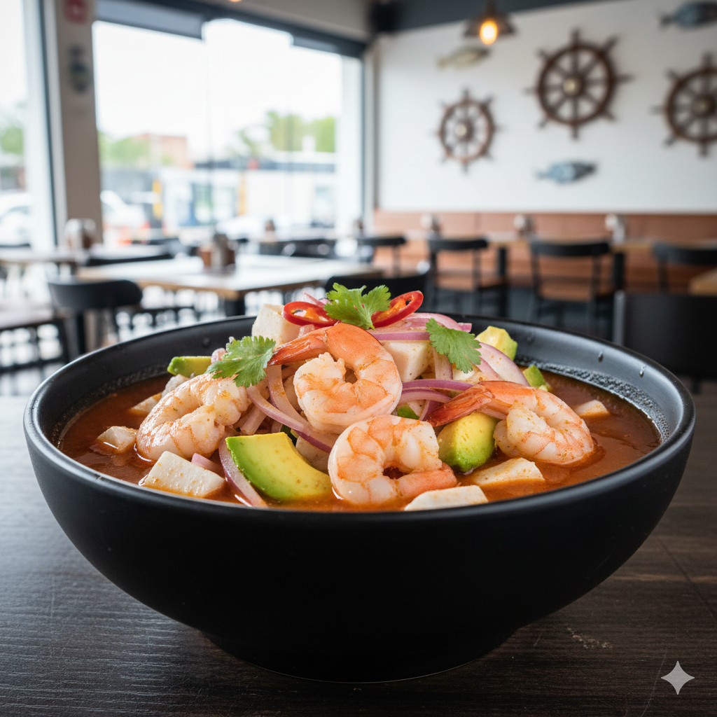 240 gr. Ingredientes. Camarón cocido, Camarón crudo y pulpo fileteado, cebolla, salsa verde y pepino.