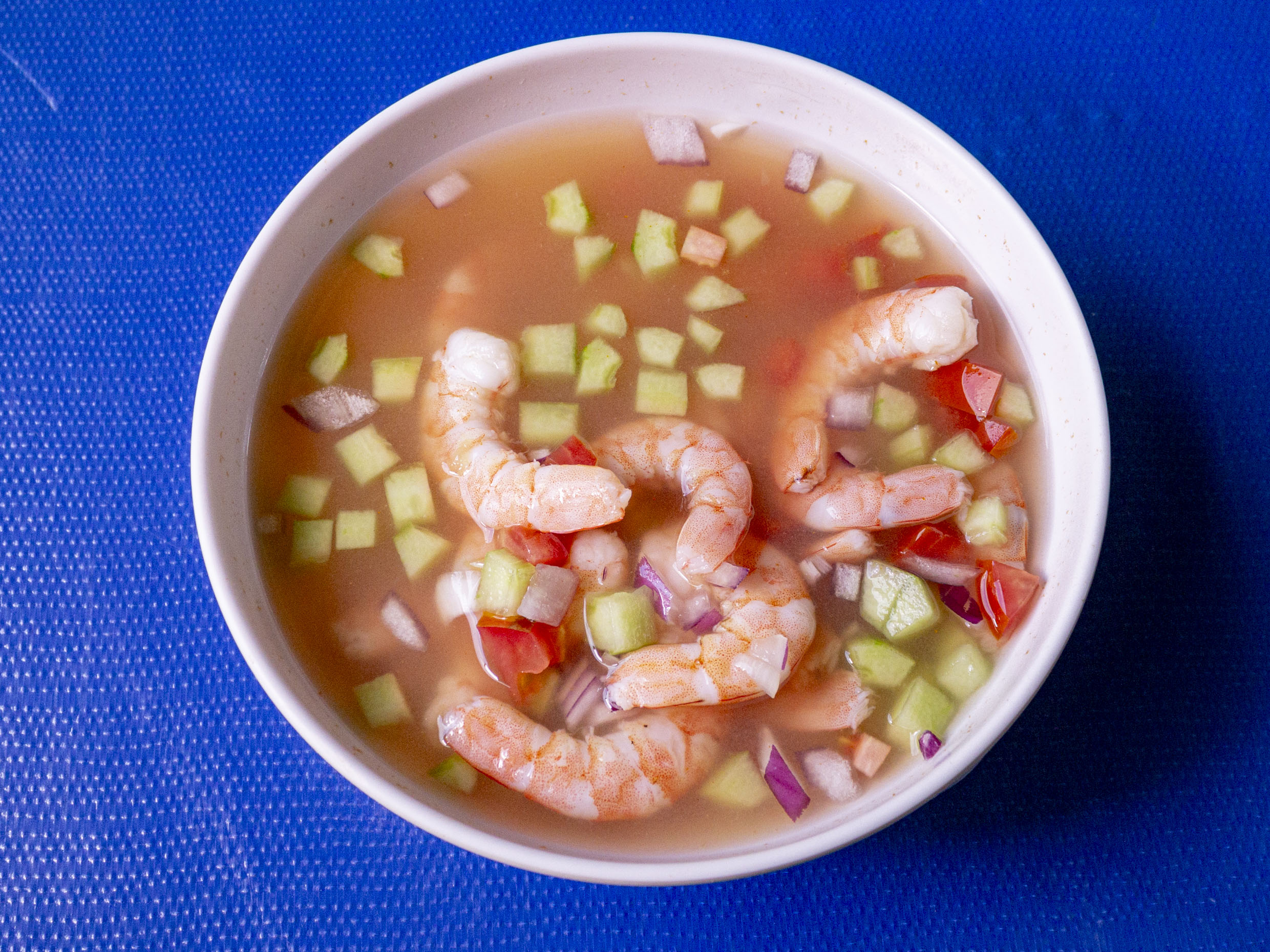 Camarón cocido con pepino, tomate, cebolla, cilantro y un toque de kermato