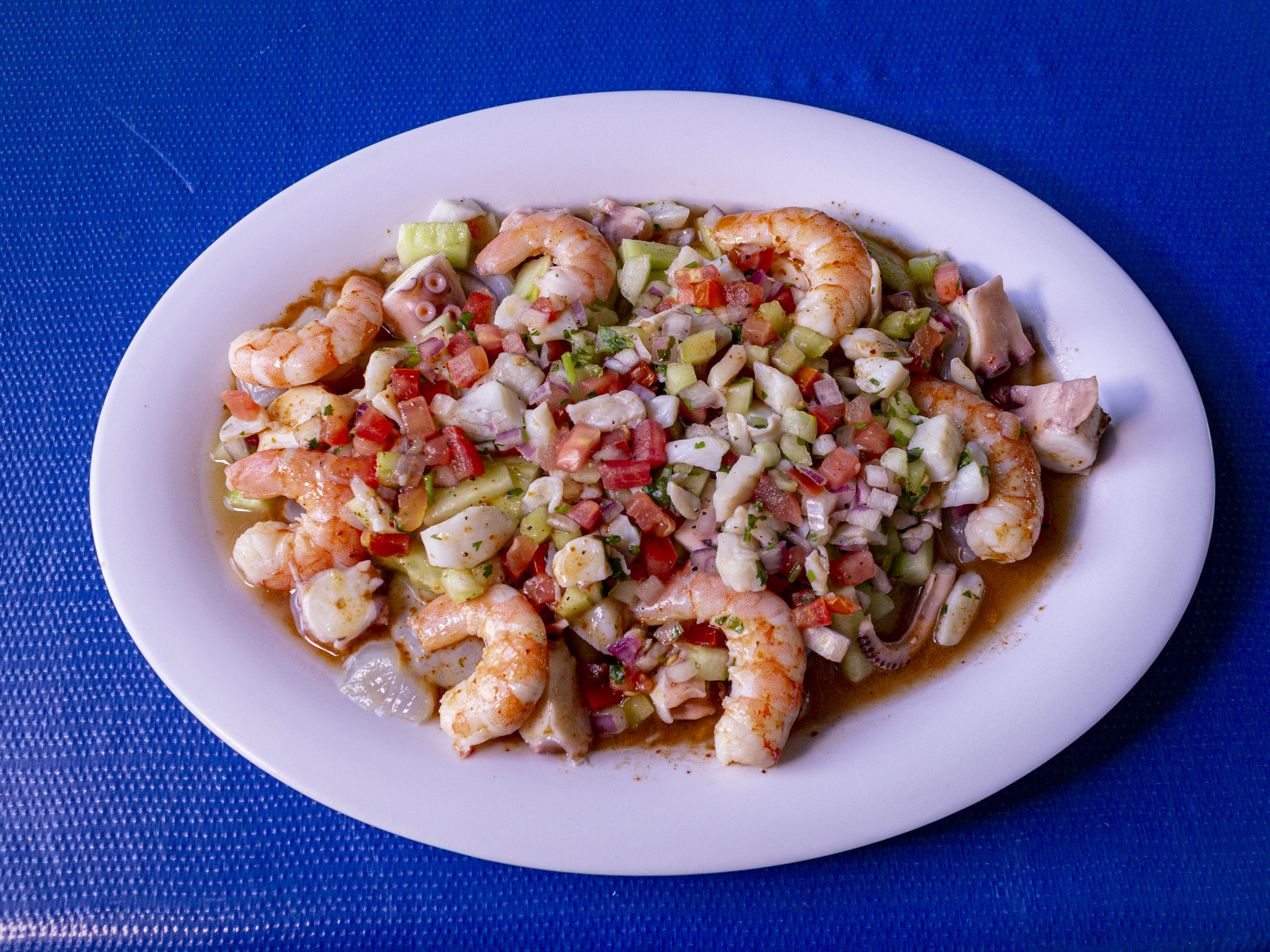 Camarón cocido y crudo con pepino, tomate, cebolla, cilantro y un toque de kermato