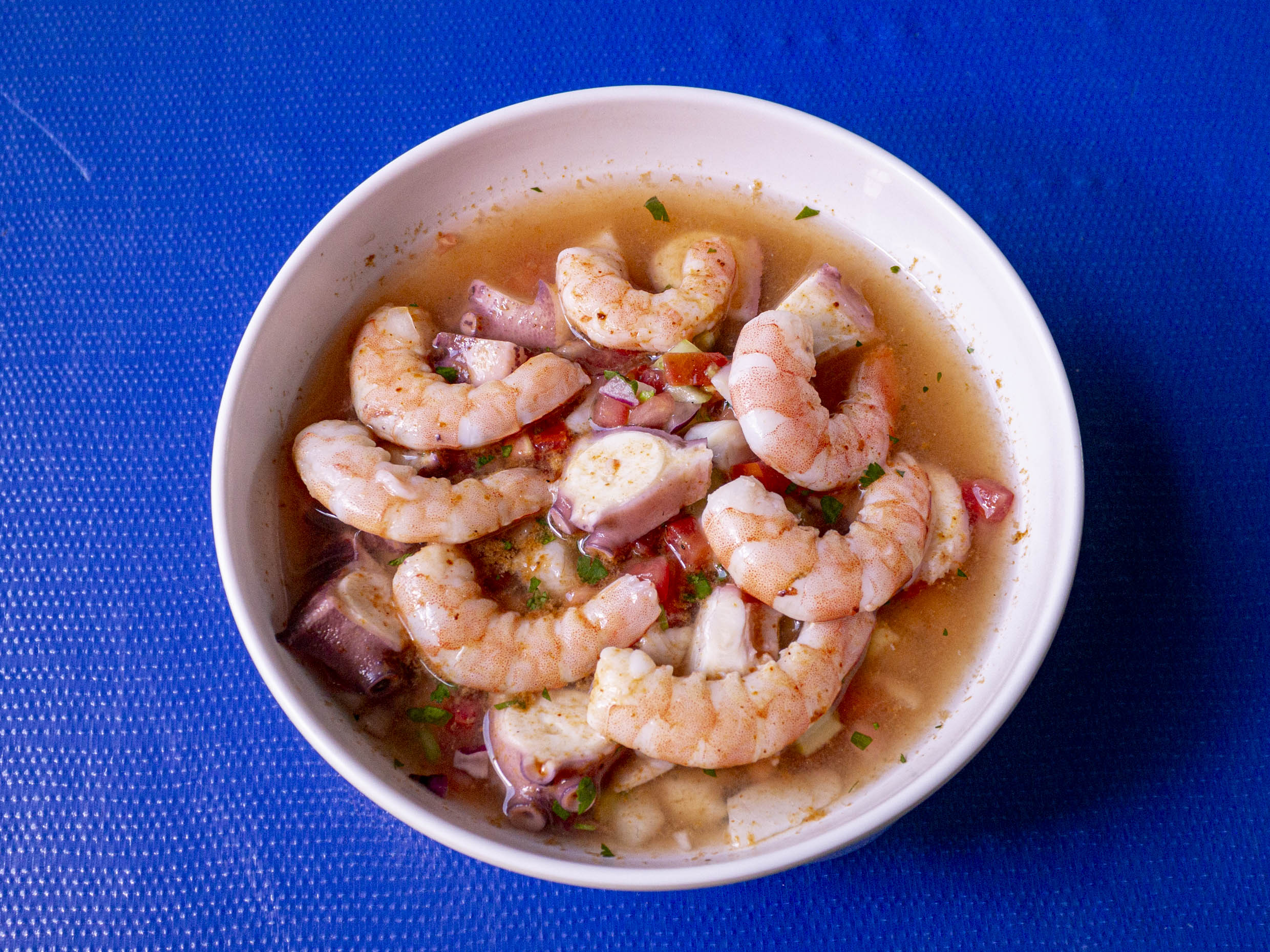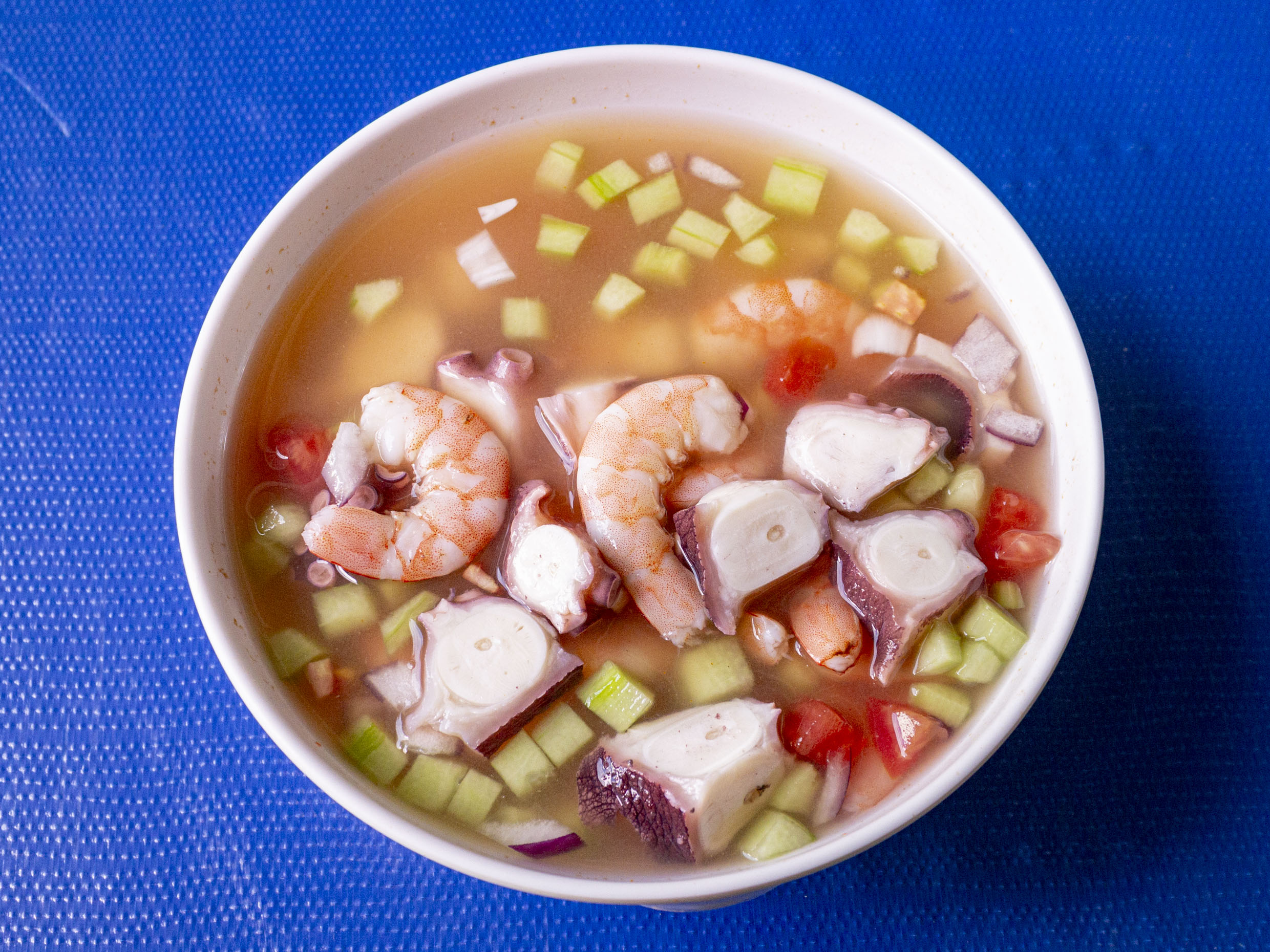 Camarón cocido y pulpo con pepino, cebolla, tomate y jugo de camarón