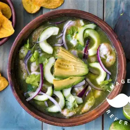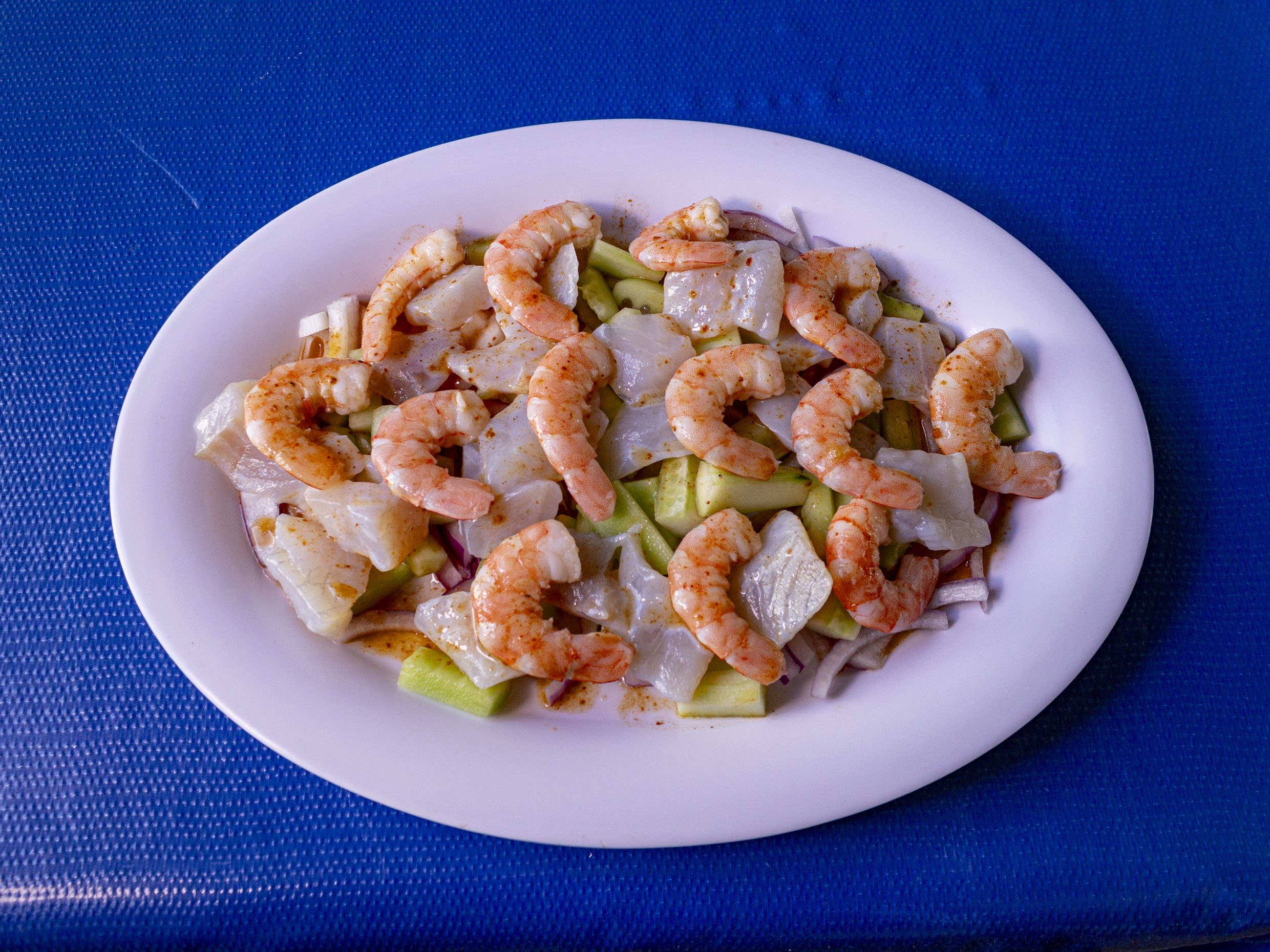 Camarón crudo con pepino, tomate, cebolla, cilantro y un toque de kermato