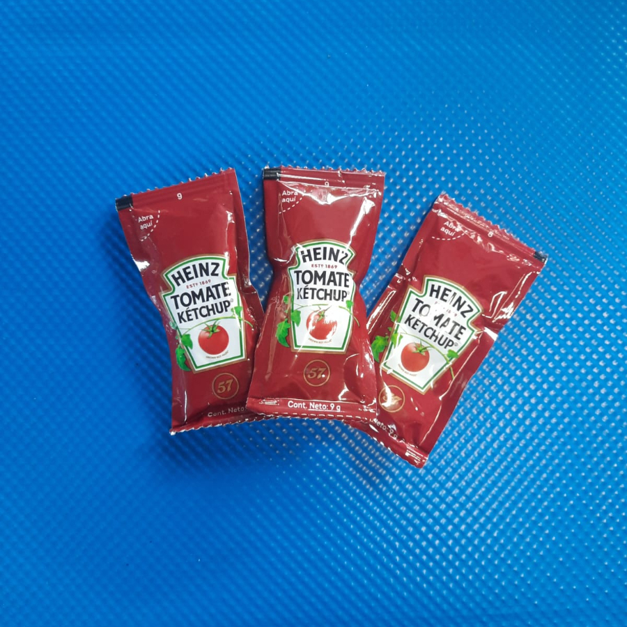 Tres sobres de cátsup marca Heinz,