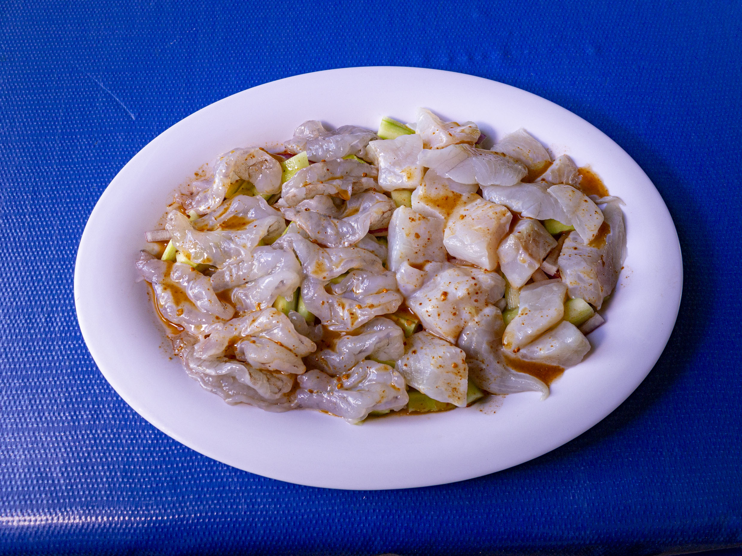 Camarón cocido, camarón crudo, pulpo, callos de lobina y ceviche de pescado con picante