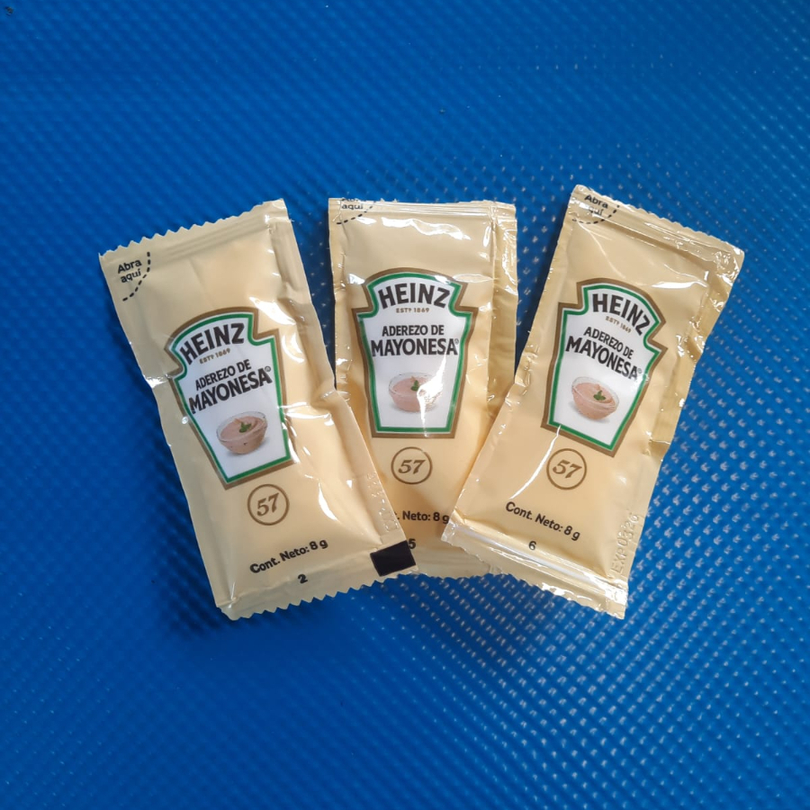 Tres sobres de mayonesa marca Heinz,