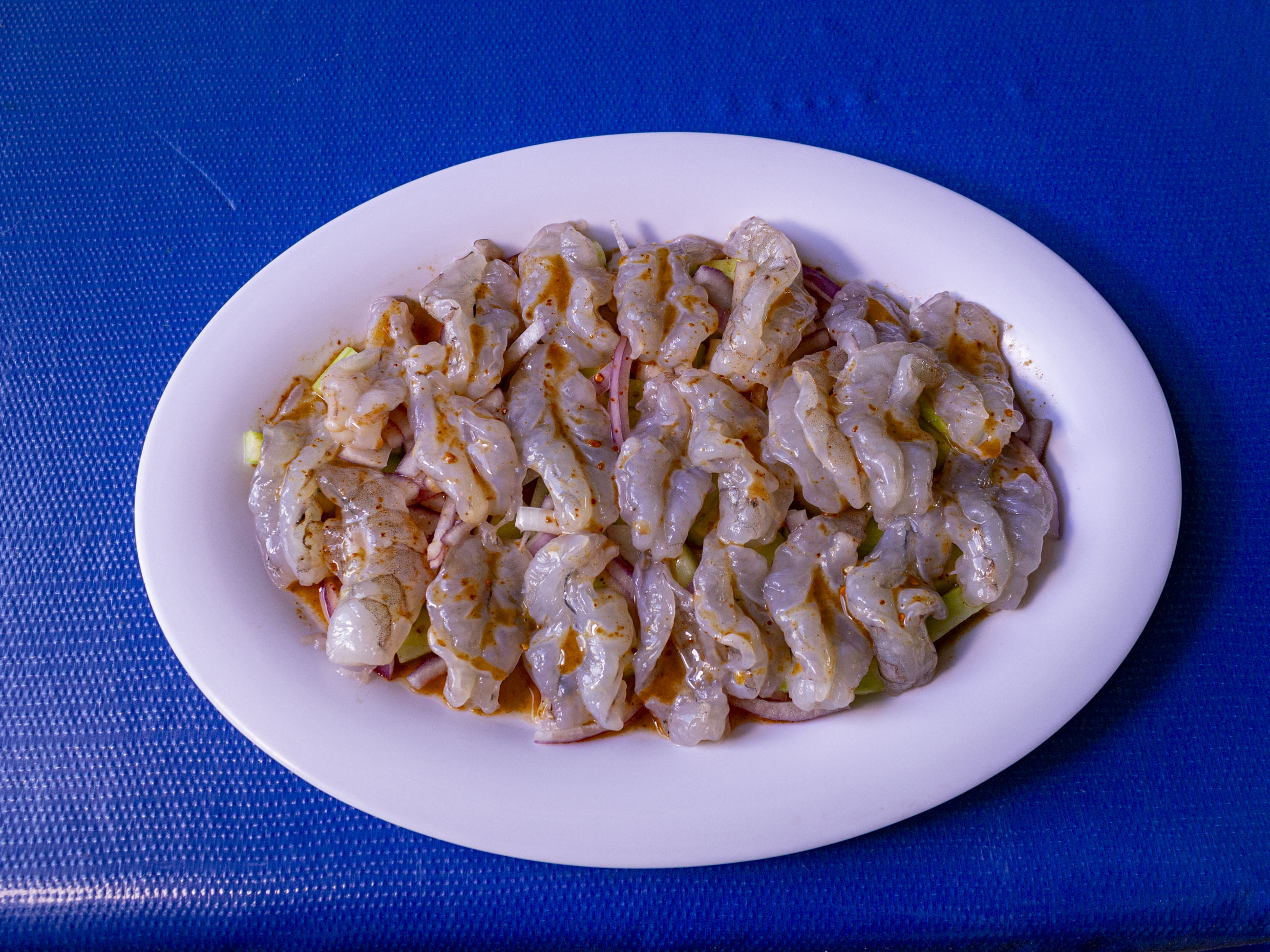 Camarón cocido con cebolla y pepino bañado en salsas negras
