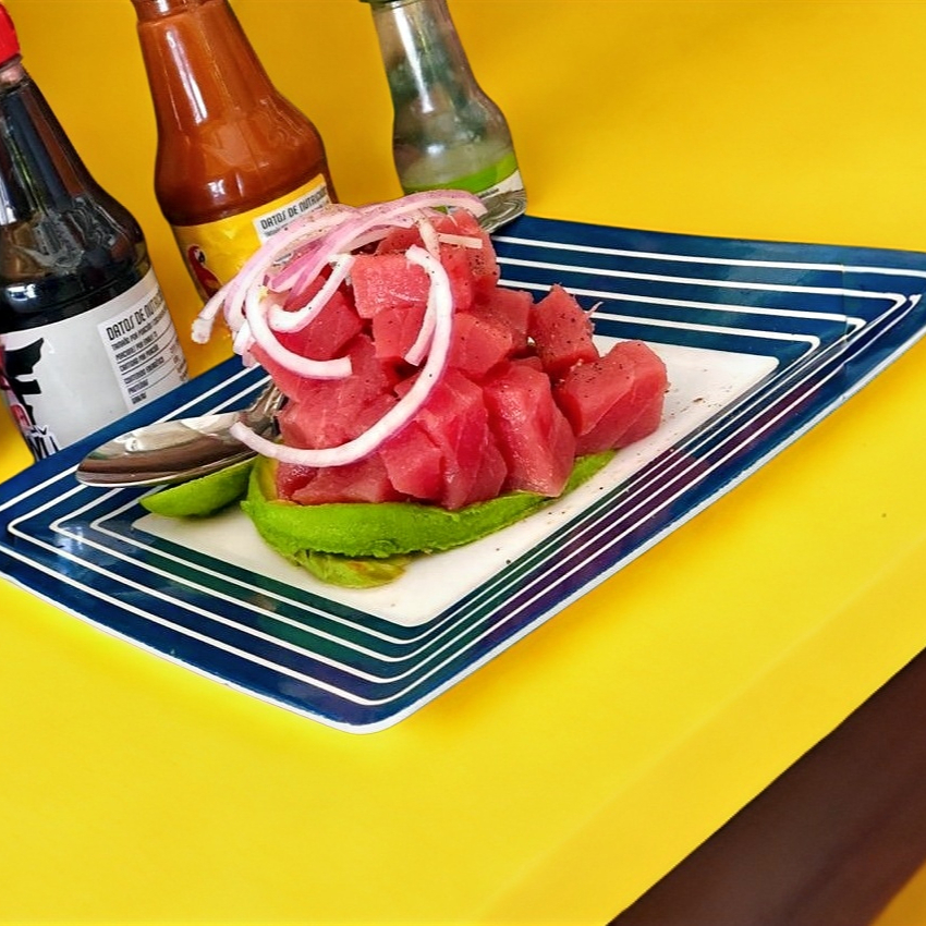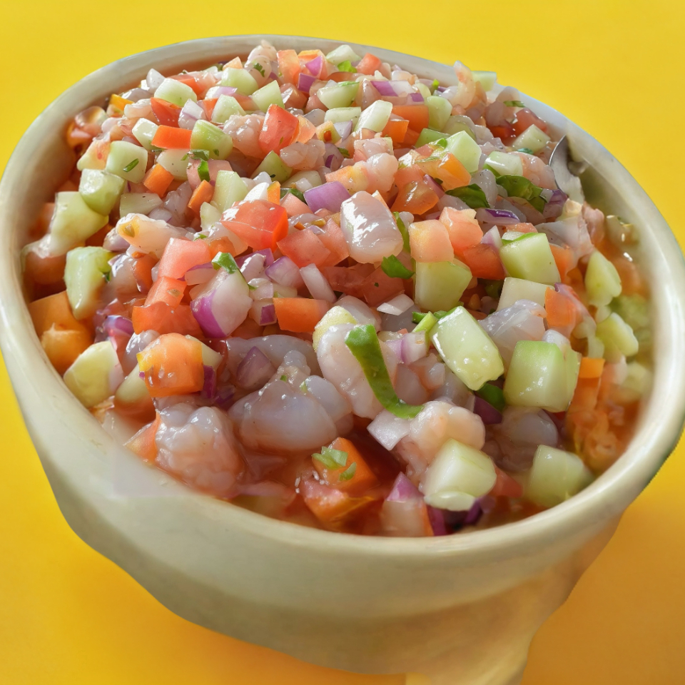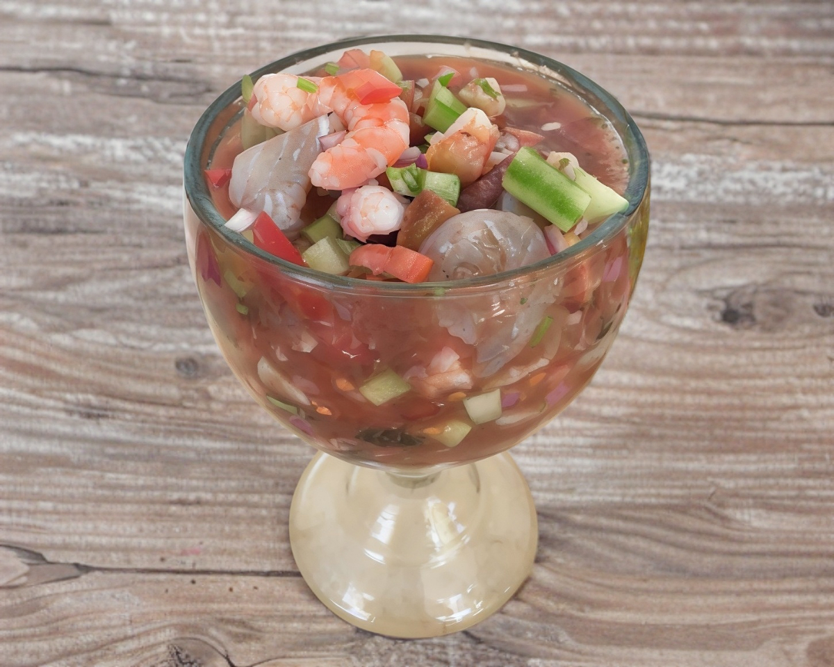 Camarón, pulpo, aguachile, caracol, ostión, pata de mula, ceviche, callos, pepino, tomate y cebolla.