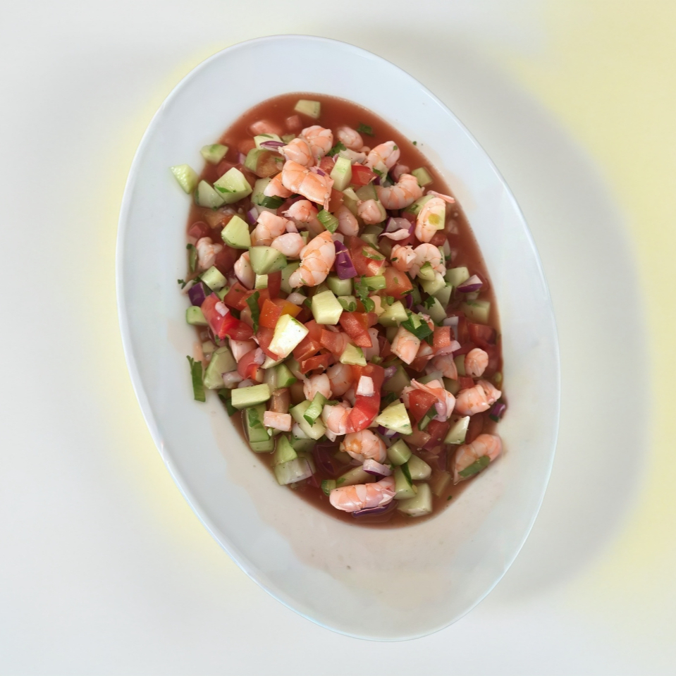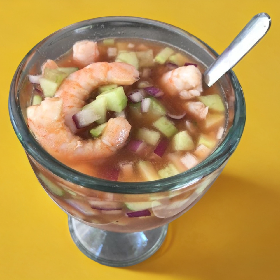 Camarón crudo, camarón cocido, pepino y cebolla.