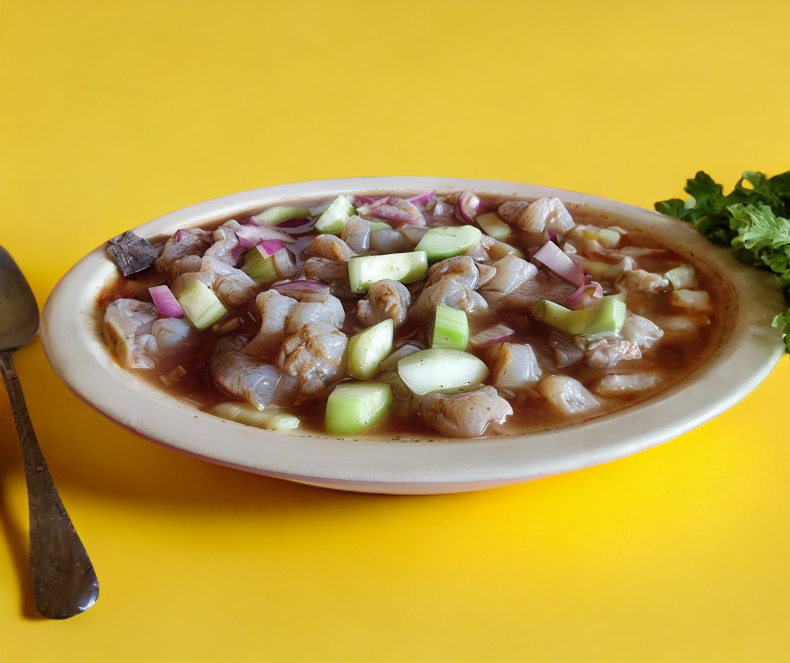 camaron cosido, aguachile, pulpo,pepino y cebolla