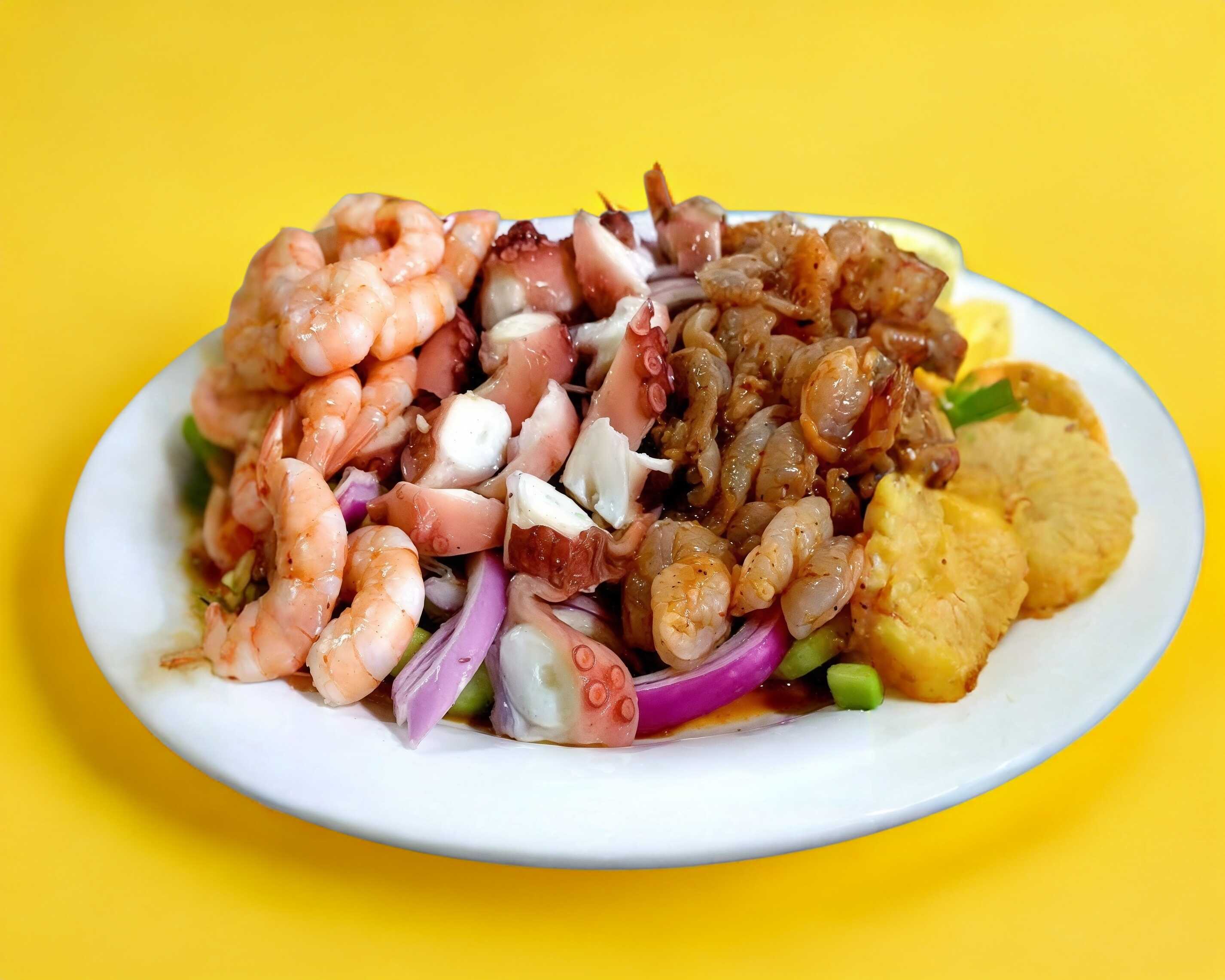 MEZCLA DE MARISCOS, CAMARON, CALLO DE LOBINA, CARACOL, PULPO, PATA DE MULA Y OSTION.