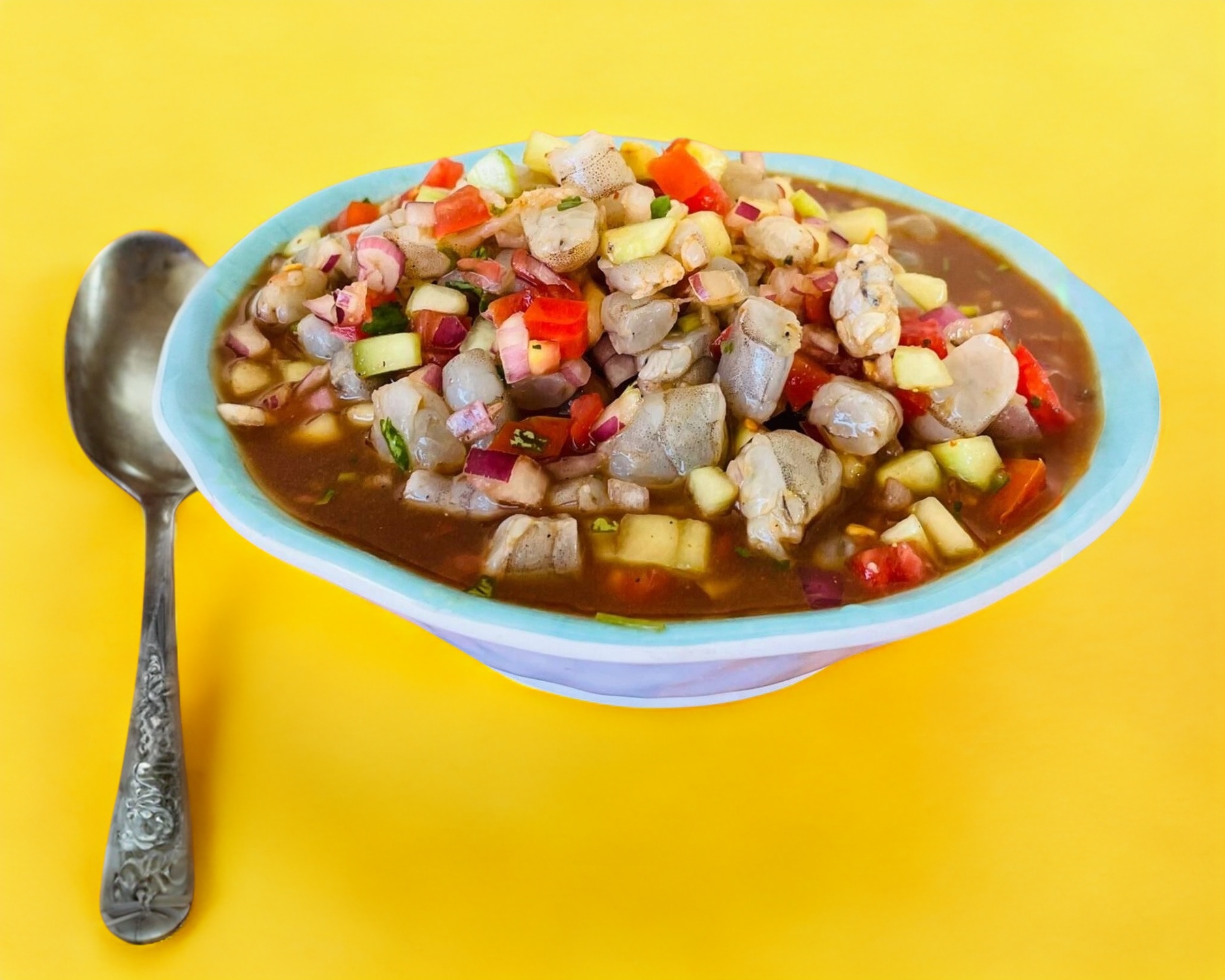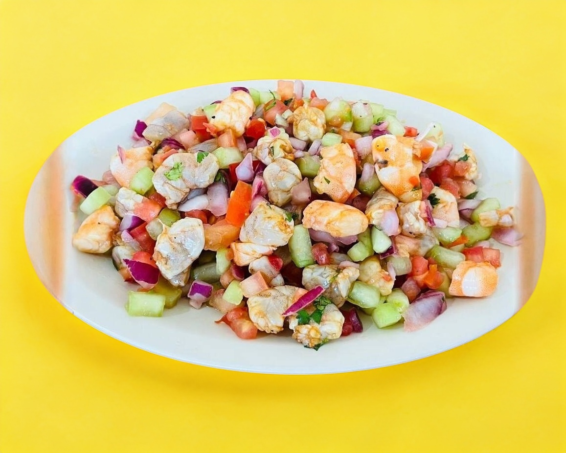 CEVICHE TRADICIONAL DE CAMARON COCIDO SALSEADO Y VERDURAS.