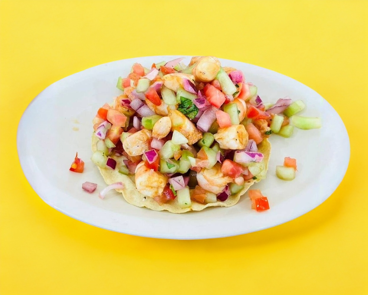 TOSTADA DE CEVICHE DE CAMARON COCIDO SALSEADO Y VERDURAS.