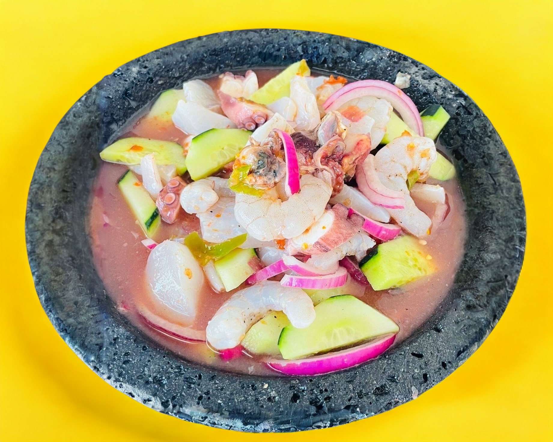 AGUACHILE DE CAMARON CRUDO, CAMARON COCIDO Y PULPO.