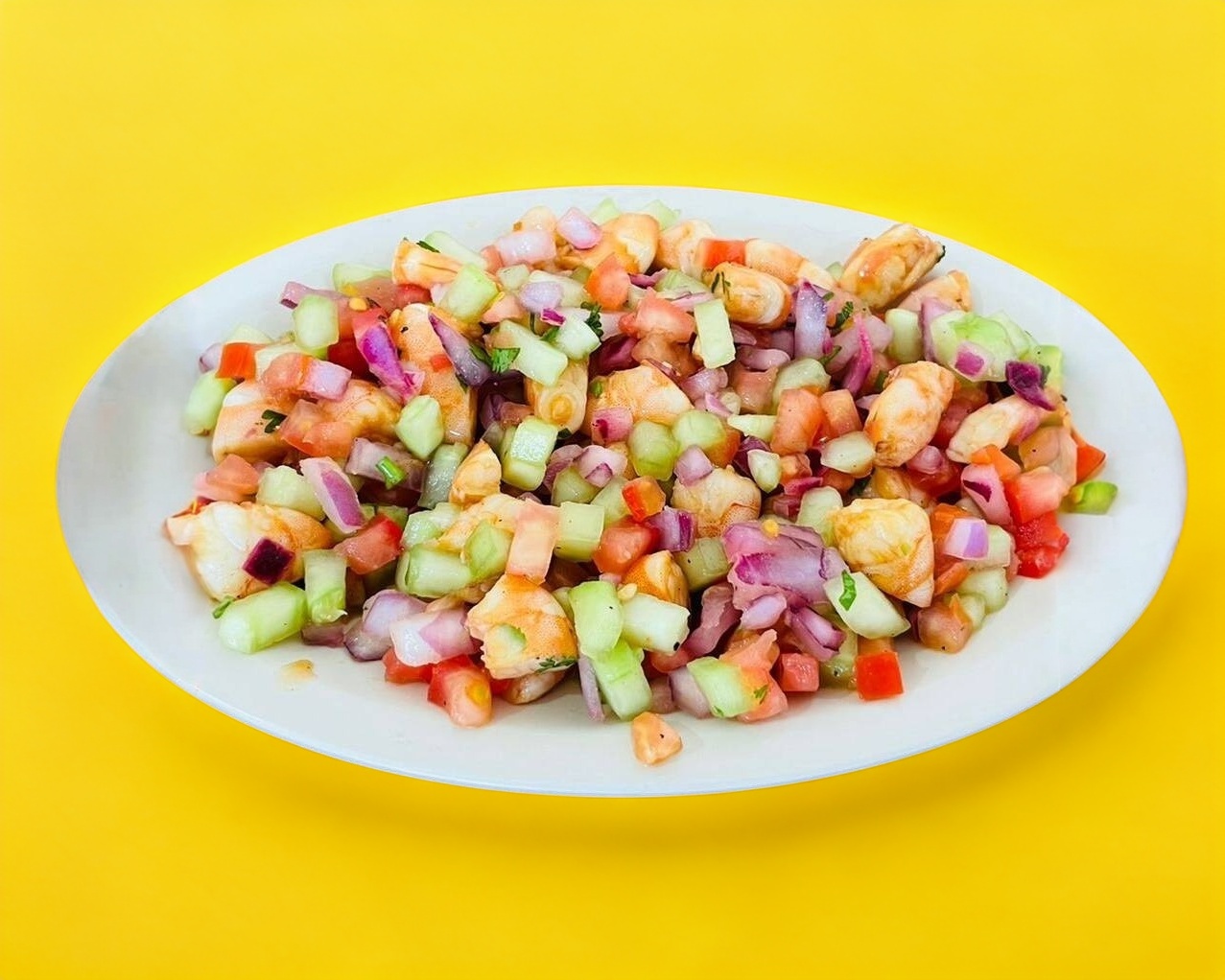 CEVICHE DE CAMARON CRUDO Y COCIDO SALSEADO CON VERDURAS.