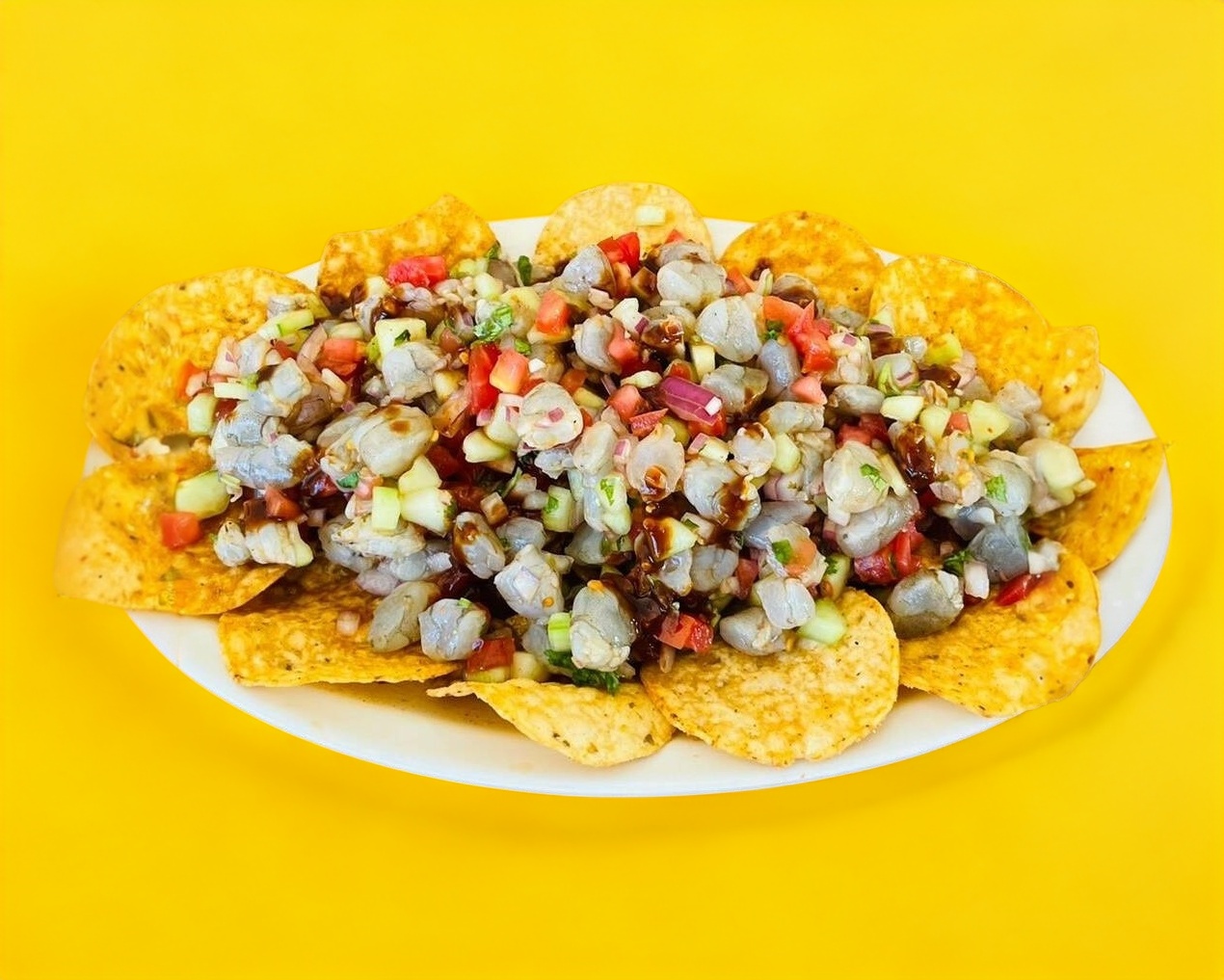 CEVICHE TRADICIONAL DE CAMARON CRUDO SOBRE UNA CAMA DE TOSTITOS.