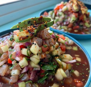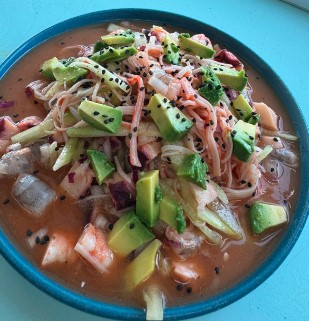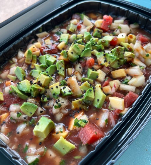Atún marinado + mango o piña* pepino, cebolla y aguacate (de temporada).