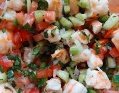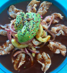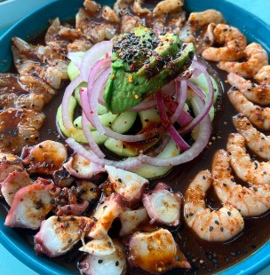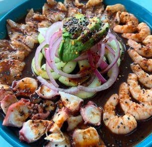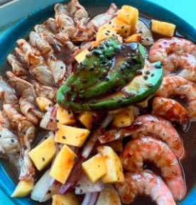Camarón mixto + coco + mango o piña, pepino, cebolla, aguacate. (de temporada).