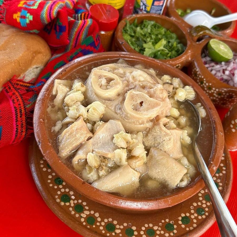 MEDIO LITRO DE MENUDO, CEBOLLA, CILANTRO, PAN TELERA, LIMONES Y SALSAS