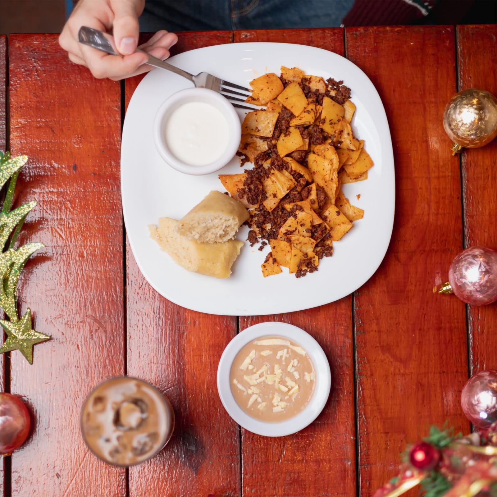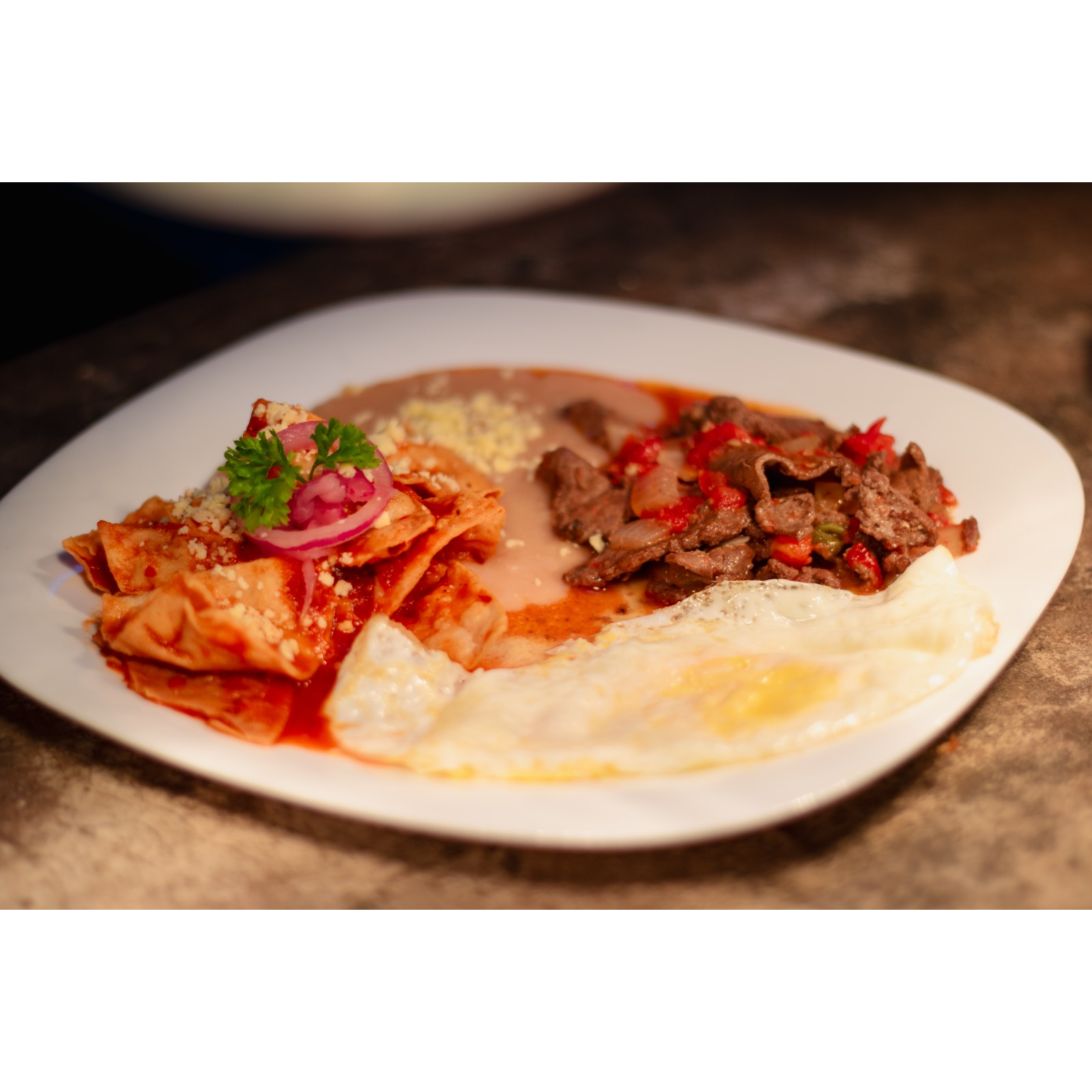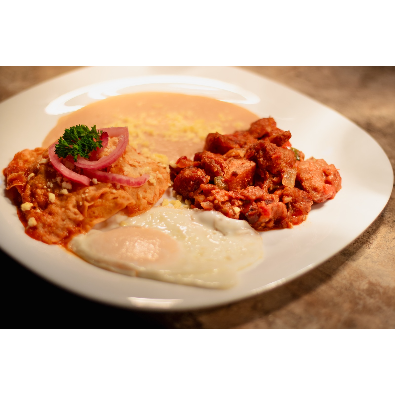 Chicharron en salsa ranchera, chilaquiles rojos, huevo estrellado o revuelto a elegir, acompañados de frijolitos con queso.
