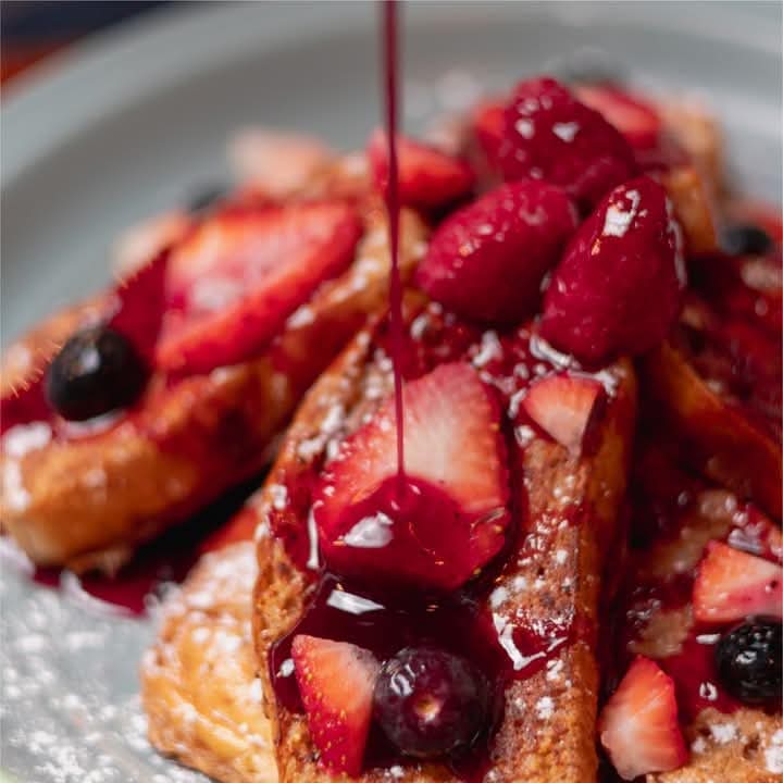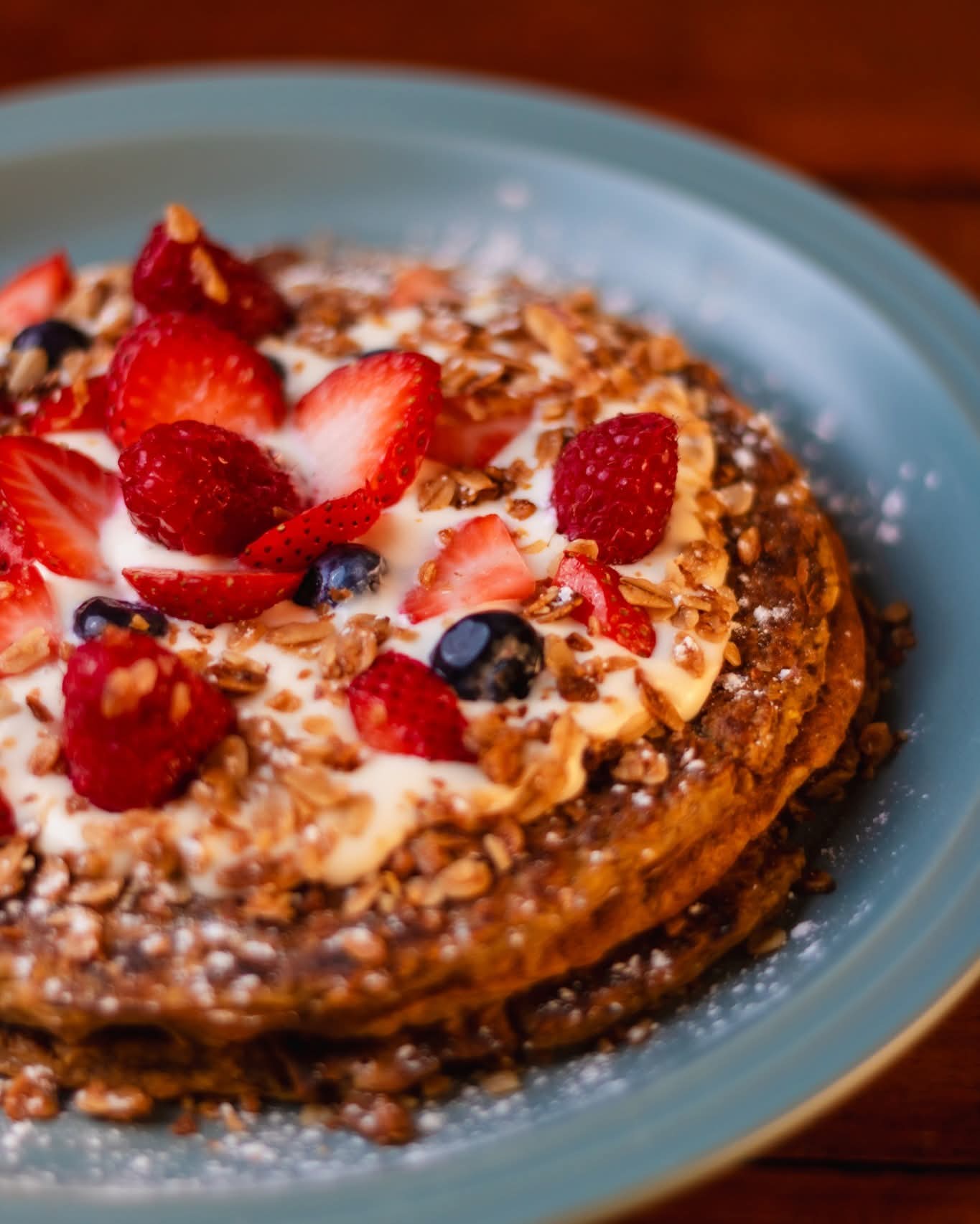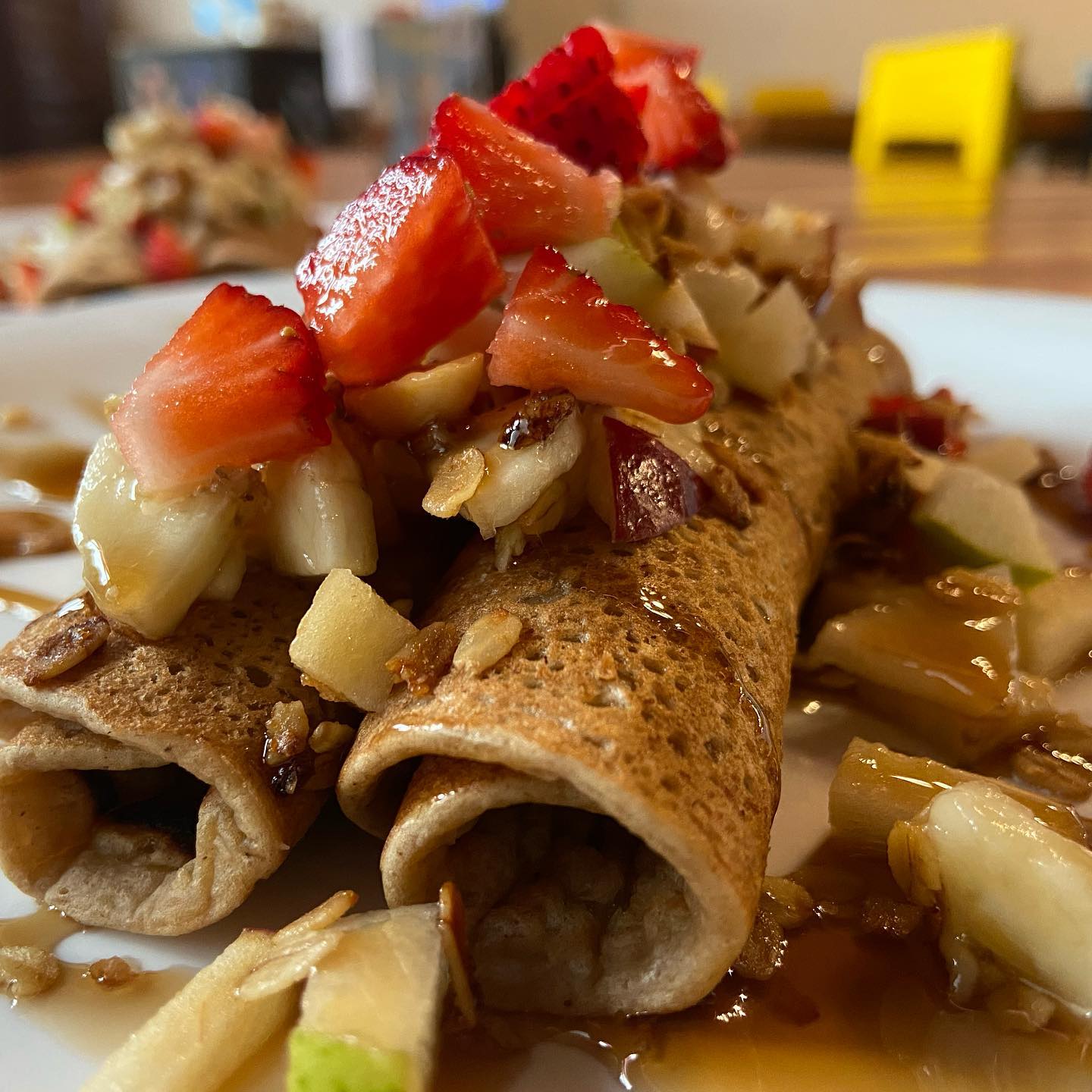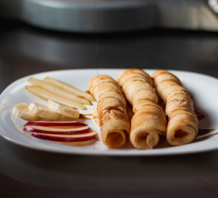 Orden de 3 piezas de panquekis enrollado con philadelphia (por dentro) y fruta encima de temporada bañada en miel maple, espolvoredo con granola.