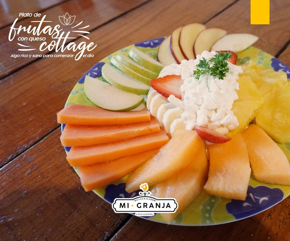 Fruta: papaya, plátano, manzana, pera, granola y miel y yogurt.