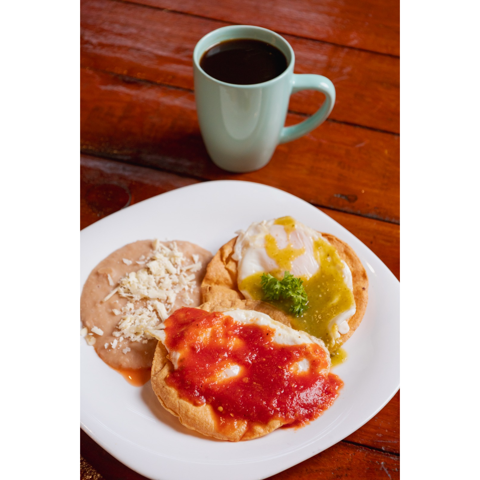 Dos huevos montados en tortilla de maiz frita, uno bañado en salsa roja y otro en salsa verde, acompañados con frijolitos con queso.