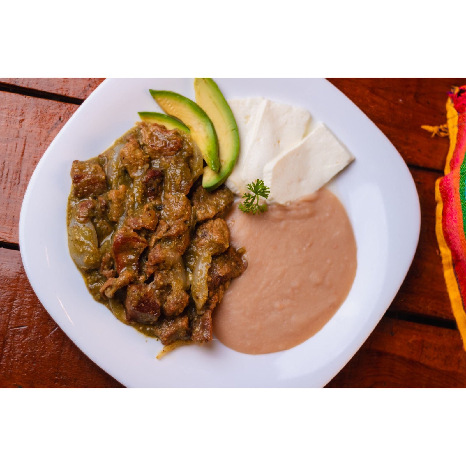 Chicharrón con salsa verde, acompañado de frijolitos con queso.