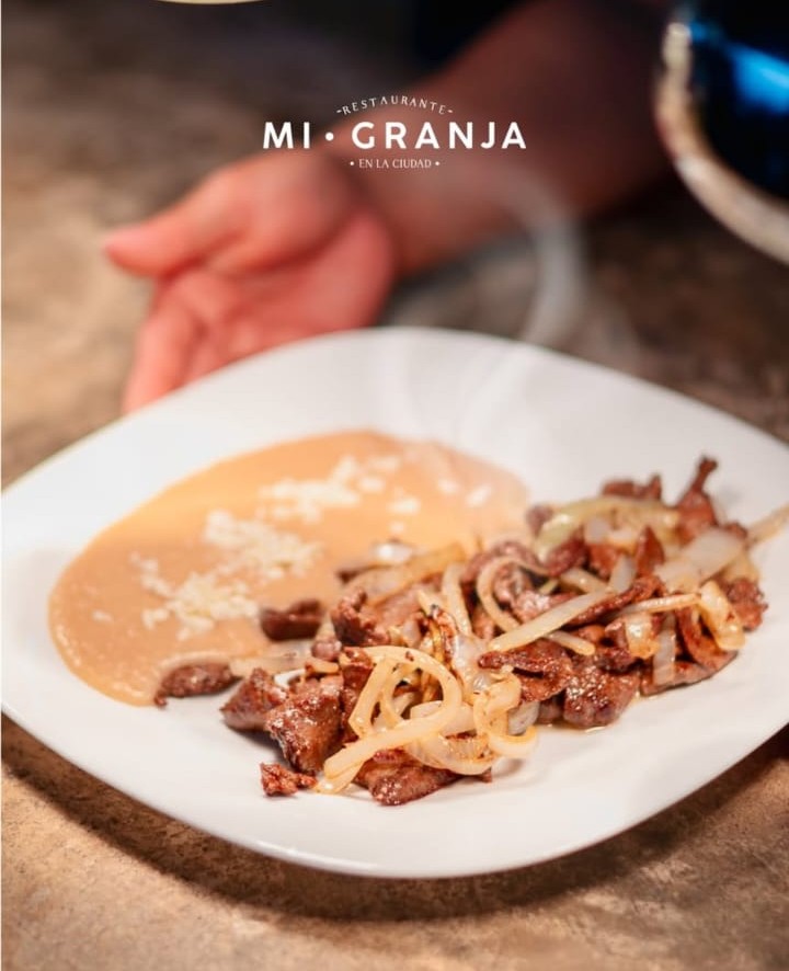 Higado encebollado, acompañado de frijolitos con queso.