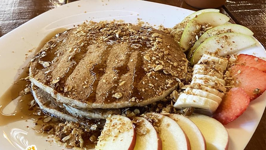 Orden de hotcakes de avena (3 piezas), acompañados de platano, vainilla y canela, fruta de temporada granola, bañados con miel maple.