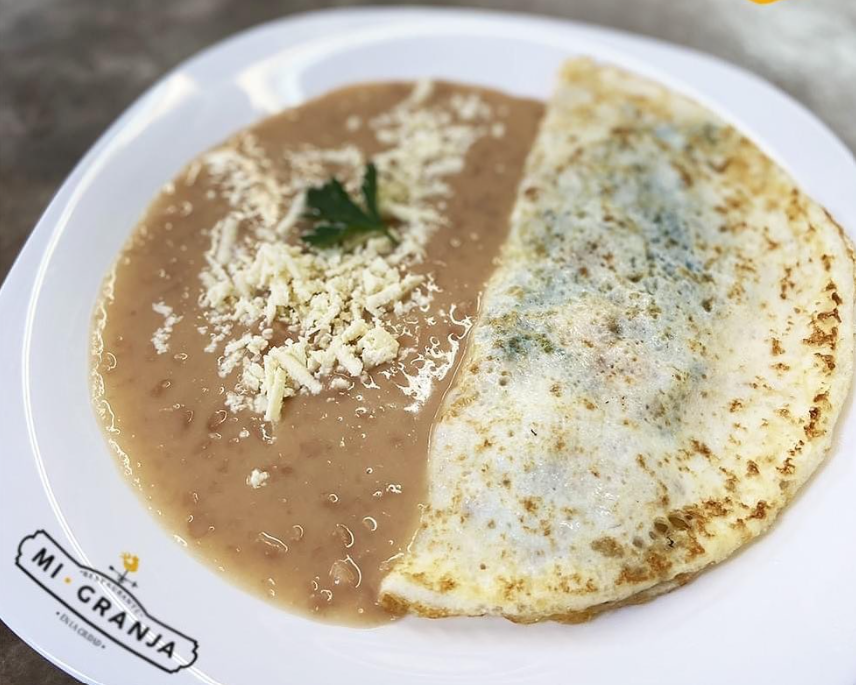 Huevo en omelette, preparado con rajas de chile poblano, elotitos con crema (por dentro), bañado en salsa poblana, acompañado con frijoles y queso.