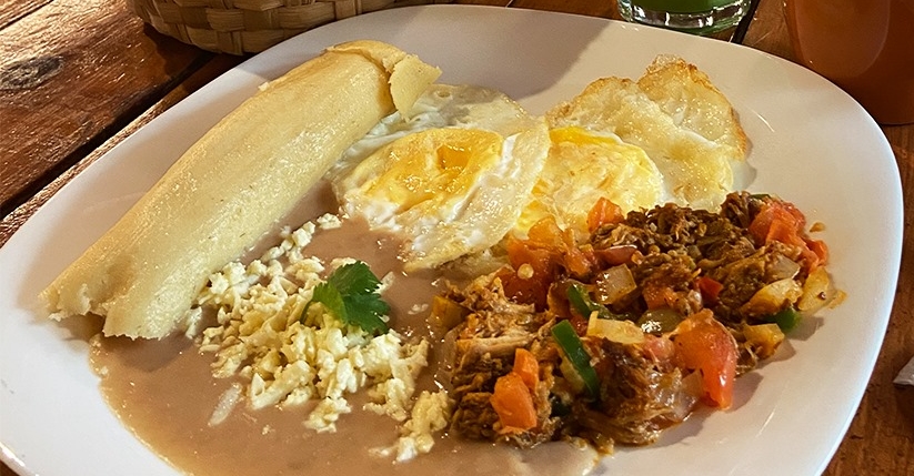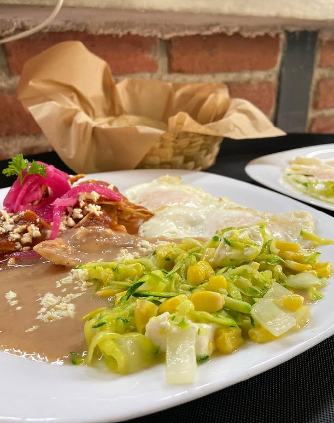 Lleva dos huevos estrellados, tamal de elote dorado o natural y chilorio a la mexicana, acompañado de frijolitos con queso.