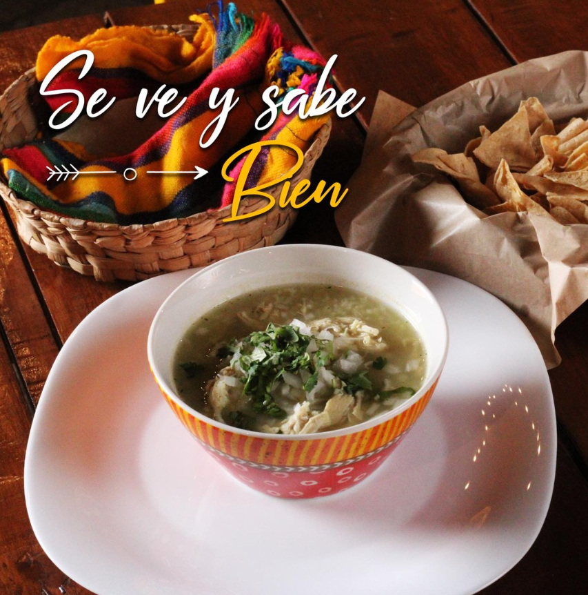 Tiras fritas de tortilla con consomé con aguacate queso y crema.