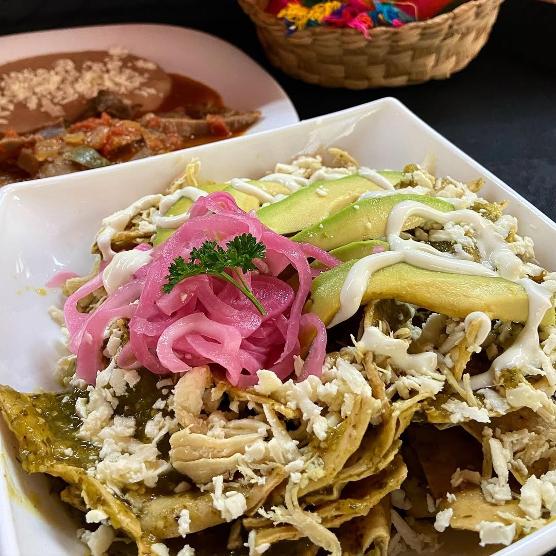 Chilaquiles poblanos, a elegir acompañamiento huevo, pollo o chorizo.