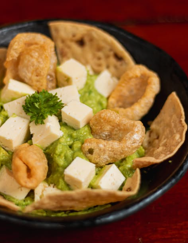 Guacamole con queso y totopos.