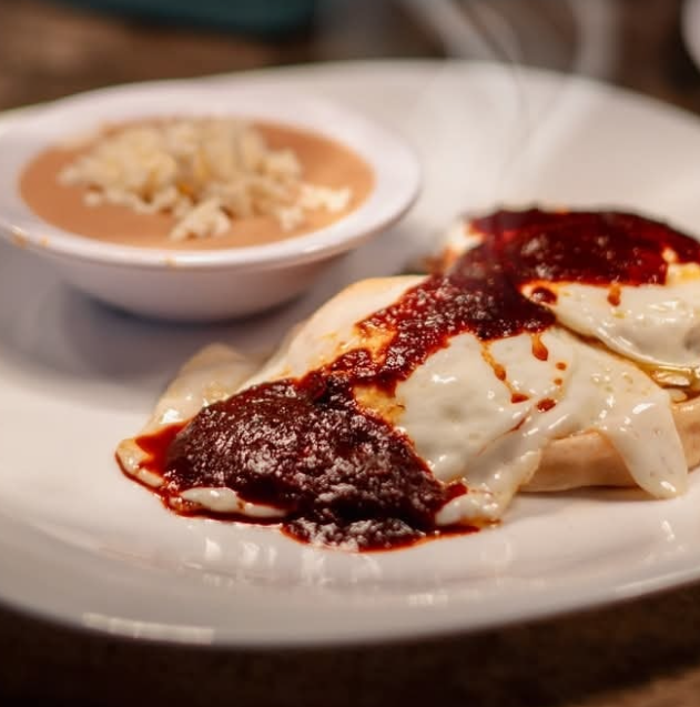 Orden de enchiladas (3 piezas), fritas en chile colorado, rellenas de queso, con verdura y queso encima, acompañadas de ricos frijolitos.