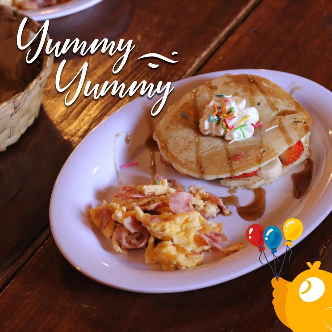 Dos piezas de hotcakes rellenos de fresa y platano acompañados de huevito estrellado con tocino o jamón a elegir.