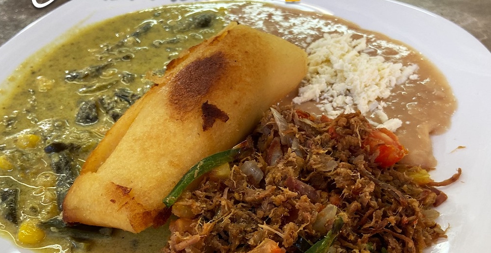 Combinacion de rajas poblanas con elote y crema acompañado de machaca, un tamal de elote dorado o natural, acompañado de frijolitos con queso.